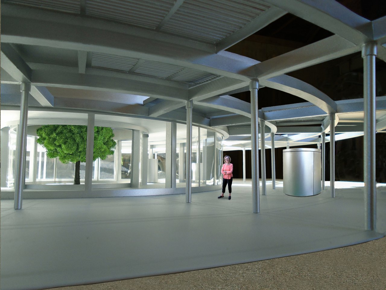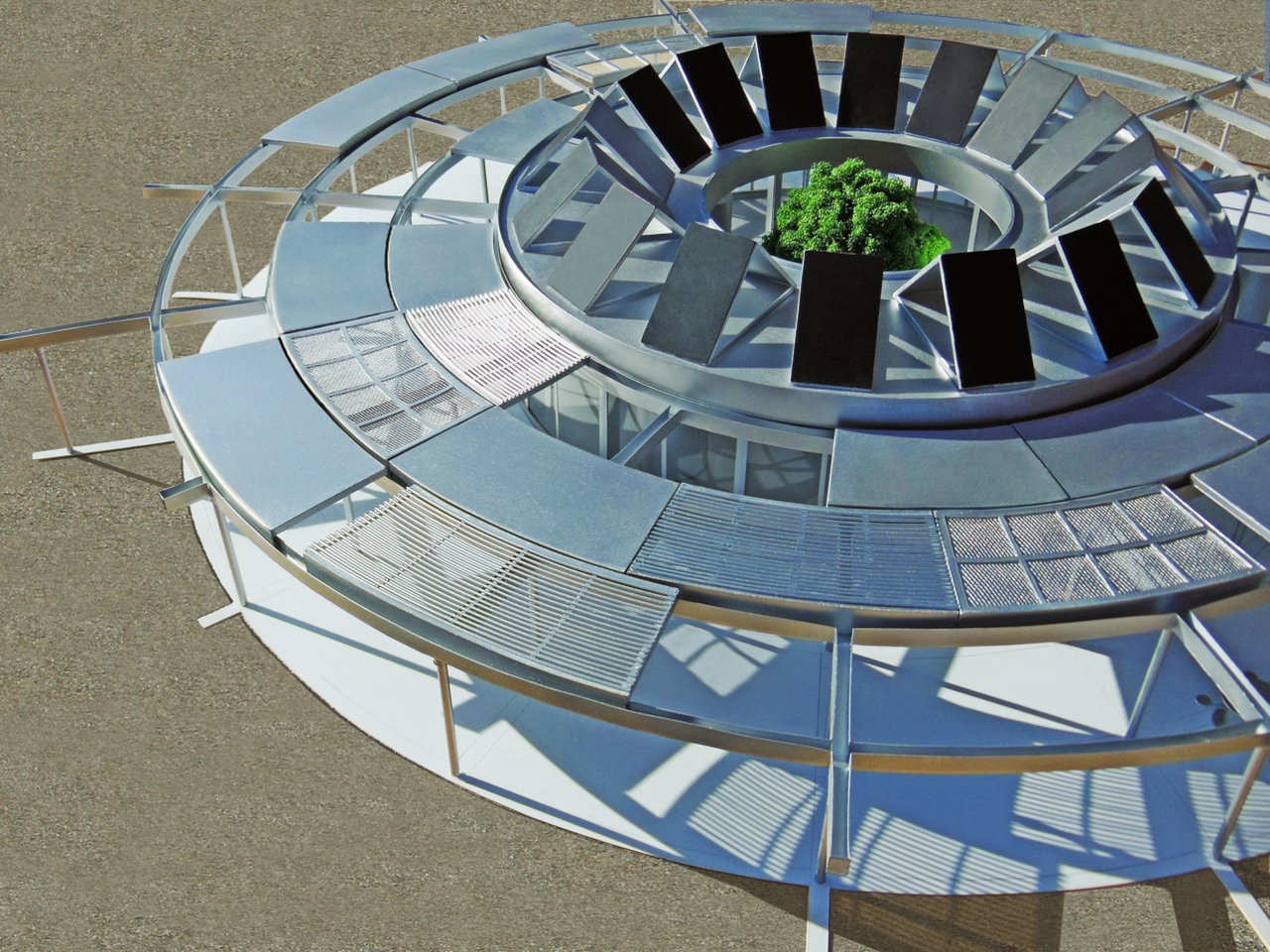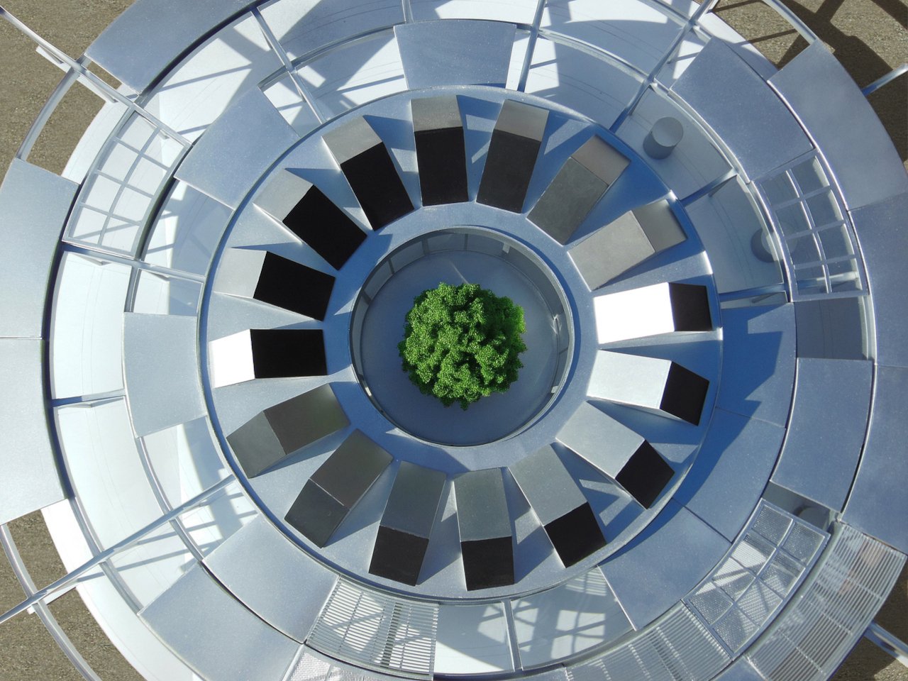 Trois des anneaux concentriques soutiennent des panneaux mobiles qui peuvent être repositionnés manuellement ou automatiquement autour du périmètre de la maison tout au long de la journée ou des saisons. Certains panneaux sont pleins pour l’ombre et l’intimité, d’autres sont dotés de verre pour capter la lumière, et d’autres encore comportent des louvres ou des écrans pour le contrôle naturel de l’air et de la ventilation.