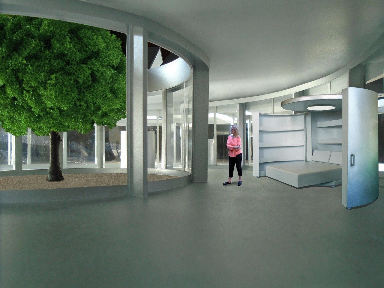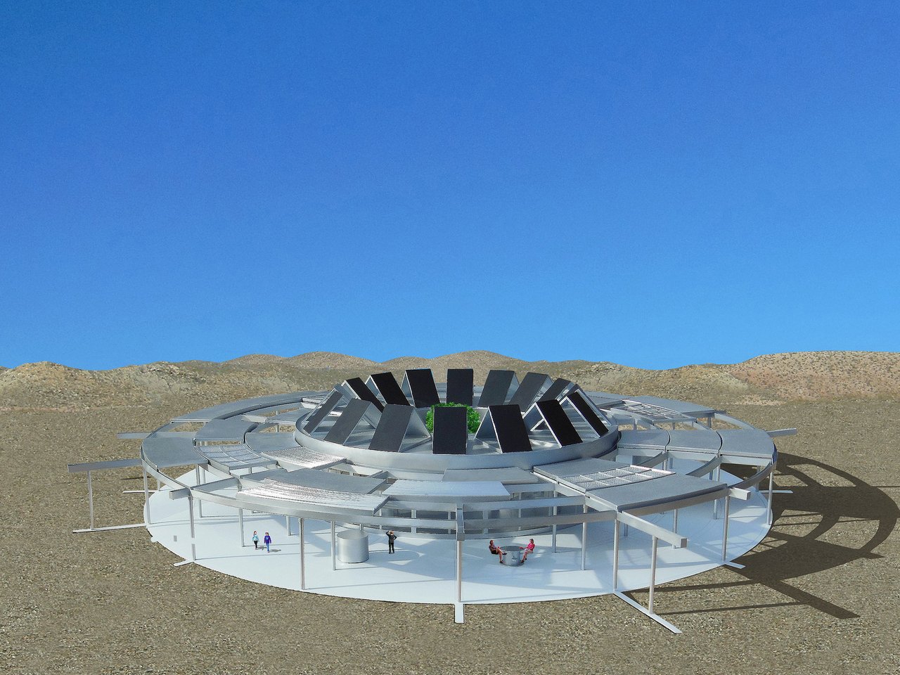 Des panneaux solaires montés autour du périmètre de la cour fournissent électricité et eau chaude pour le foyer, tandis que les anneaux interactifs invitent les résidents à façonner leur environnement en temps réel en fonction de leurs besoins immédiats. La forme métallique et géométrique de la maison crée un contraste visuel frappant contre les paysages naturels.