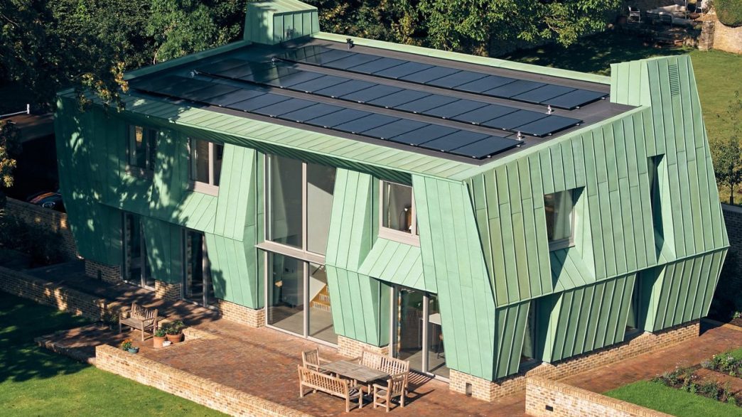 La Copper Bottom House, conçue par Adrian James Architects, est une maison de deux étages dotée d’un revêtement en cuivre vert-patiné et de panneaux solaires. Située à Oxford sur une prairie sauvage, elle se distingue par sa forme cuboïde et sa carapace de cuivre sculpturale.