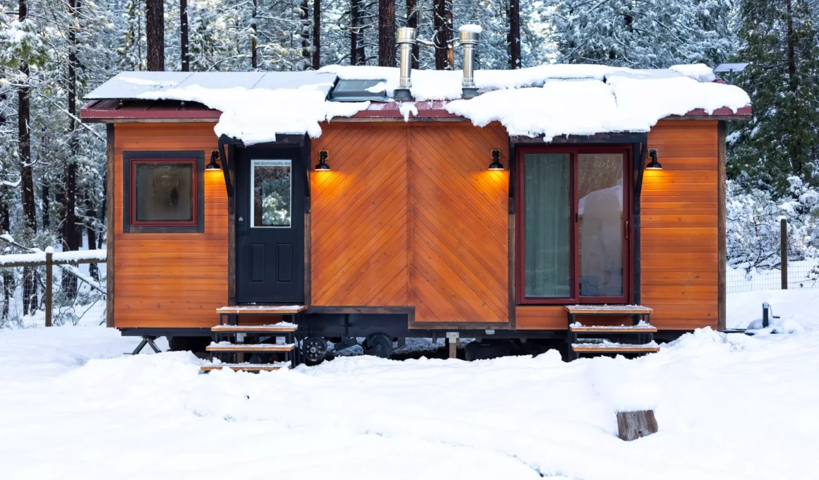 Érigée sur une remorque à double essieu, cette maison mesure 10 pieds (3 mètres) de large, ce qui est plus large que la plupart des remorques conventionnelles et nécessite donc un permis pour son transport sur route. Bien que les roues soient retirées dans les photos actuelles, elles peuvent être réinstallées pour faciliter le déplacement. À l’extérieur, l’habitation est recouverte de cèdre et dotée d’un toit en métal à joints debouts, lui conférant une apparence moderne et élégante qui pourrait parfaitement s’intégrer à un environnement résidentiel.
