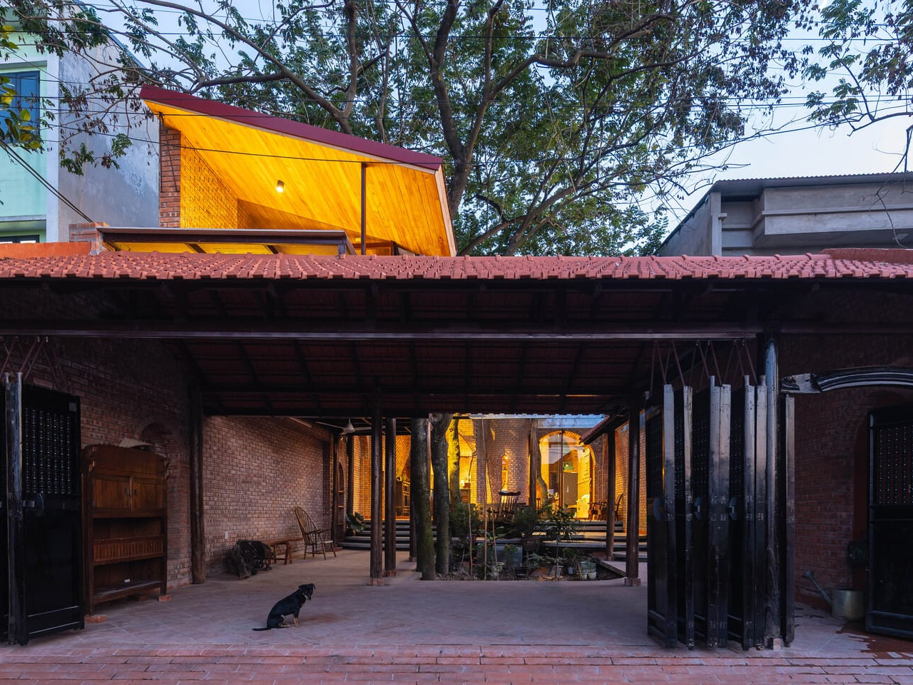 Ce qui rend ce projet remarquable, c’est sa relation avec le site. Des arbres âgés demeurent enracinés à leur position d’origine, leurs troncs étant accommodés par des encoches délibérément sculptées dans les lignes de toit. La canopée s’étend au-dessus d’une cour centrale, brouillant les frontières entre les espaces intérieurs et extérieurs. Ce jardin devient le cœur de la maison, un espace où la lumière du soleil filtre à travers les feuilles et où les générations se rassemblent. Le design crée un foyer aéré et terrestre où les zones intérieures et extérieures se rejoignent harmonieusement, permettant à la ventilation naturelle de circuler à travers la façade en brique poreuse.
