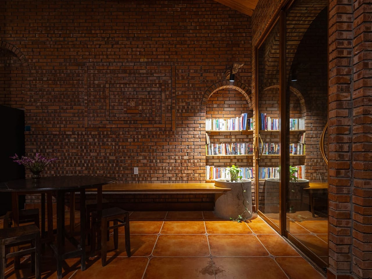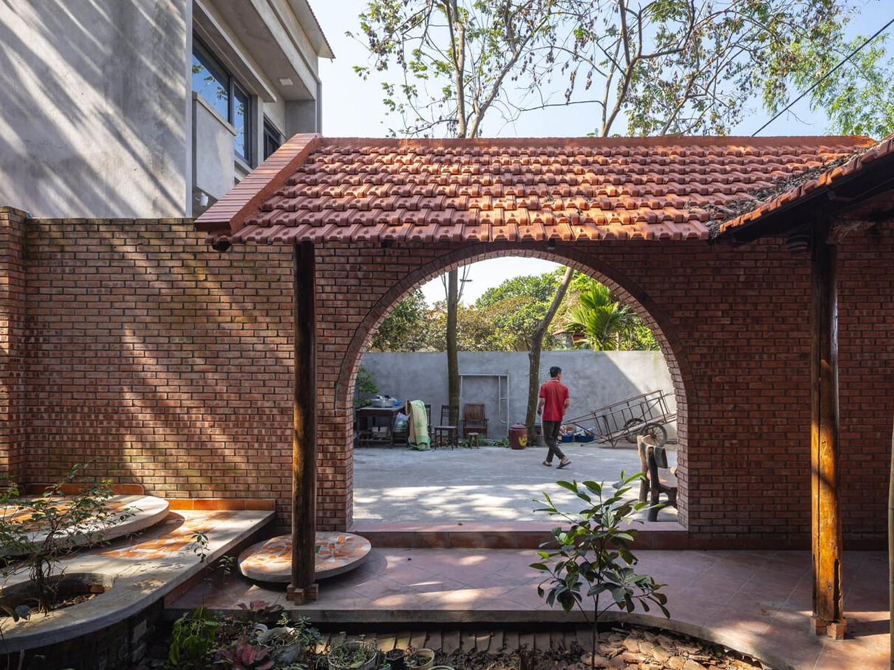 La maison Nang utilise la brique comme matériau principal, mêlant tradition et modernité avec des murs texturés et des ouvertures circulaires.