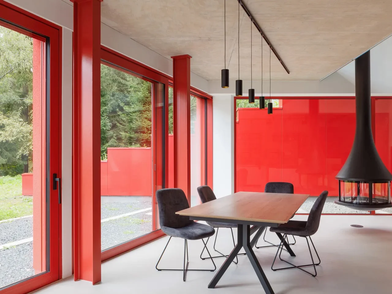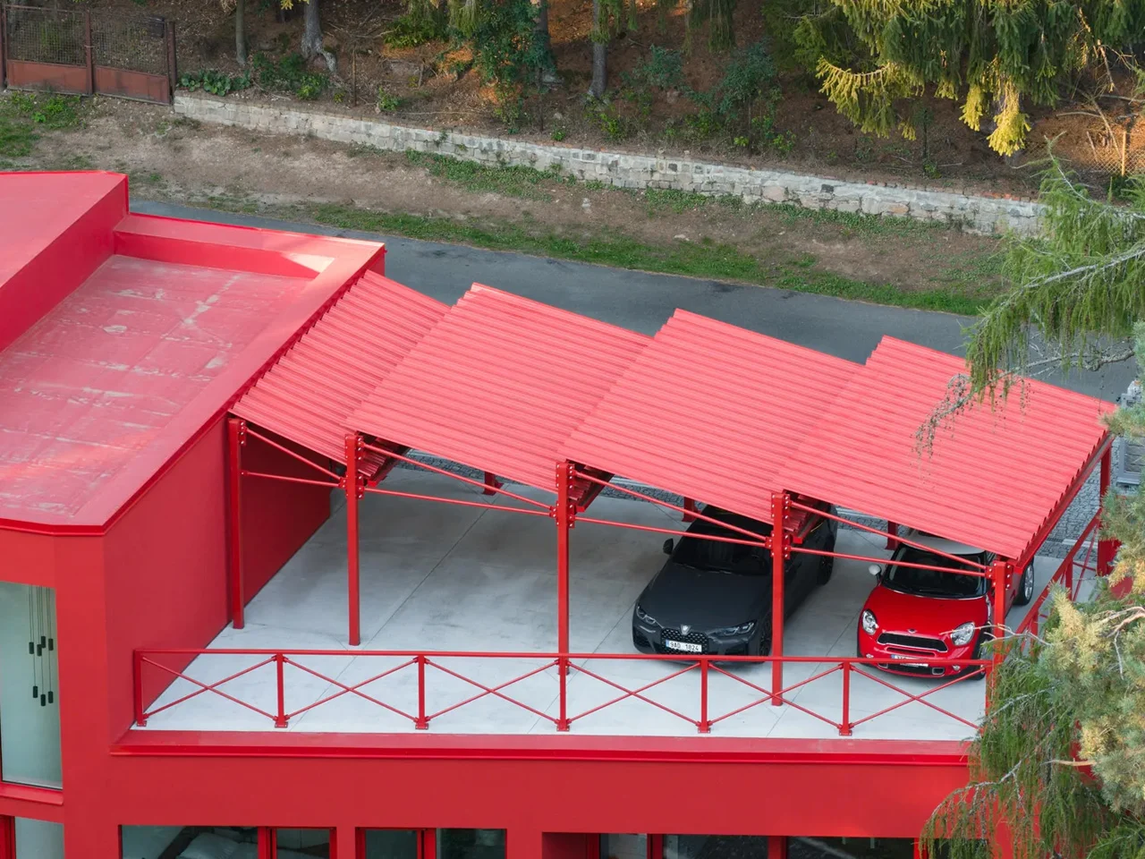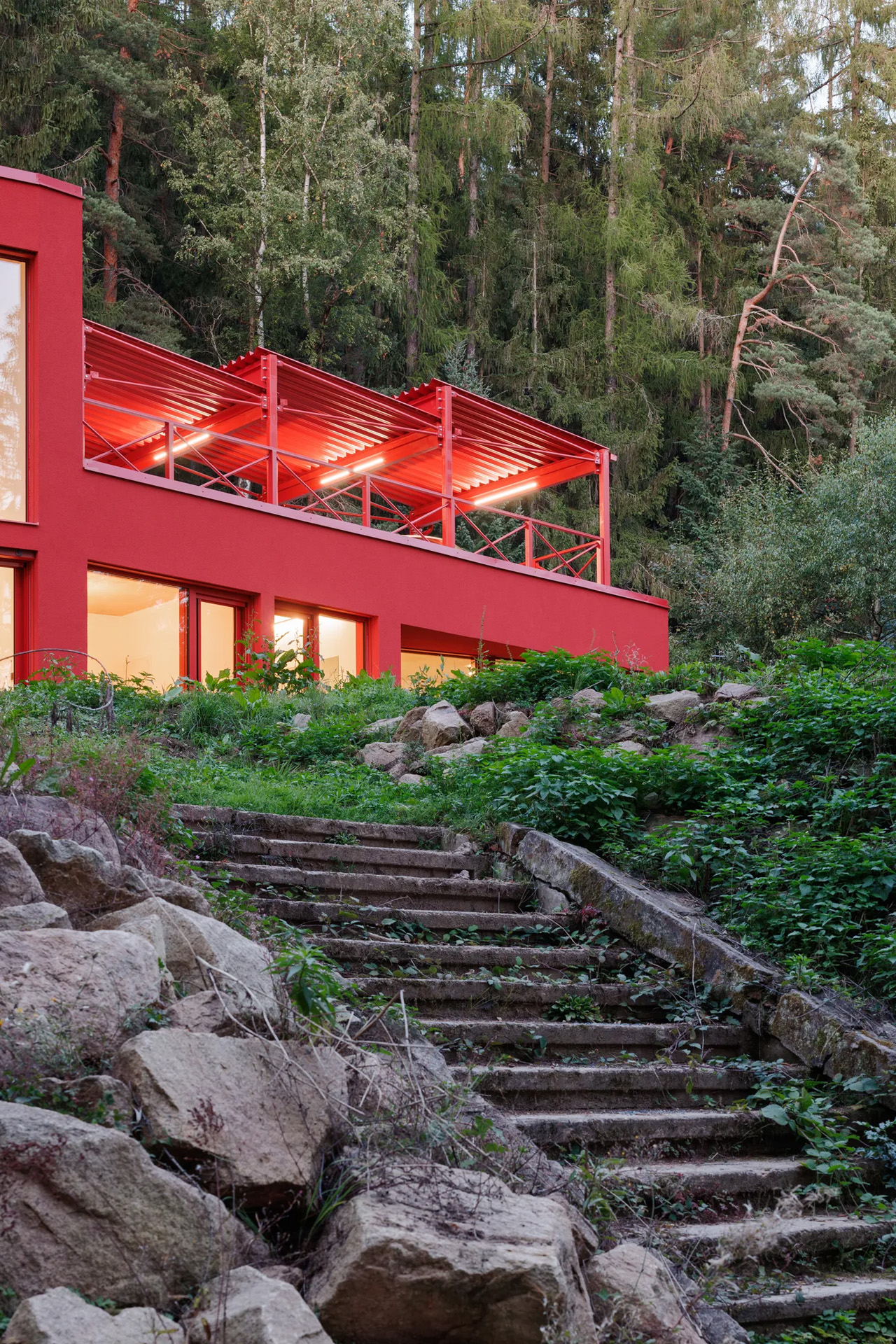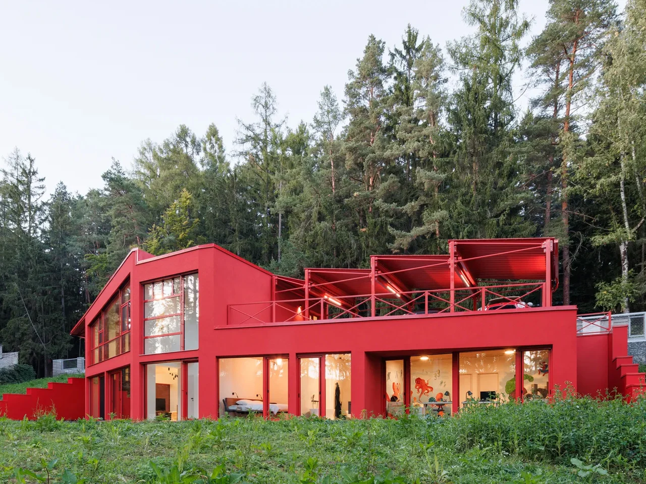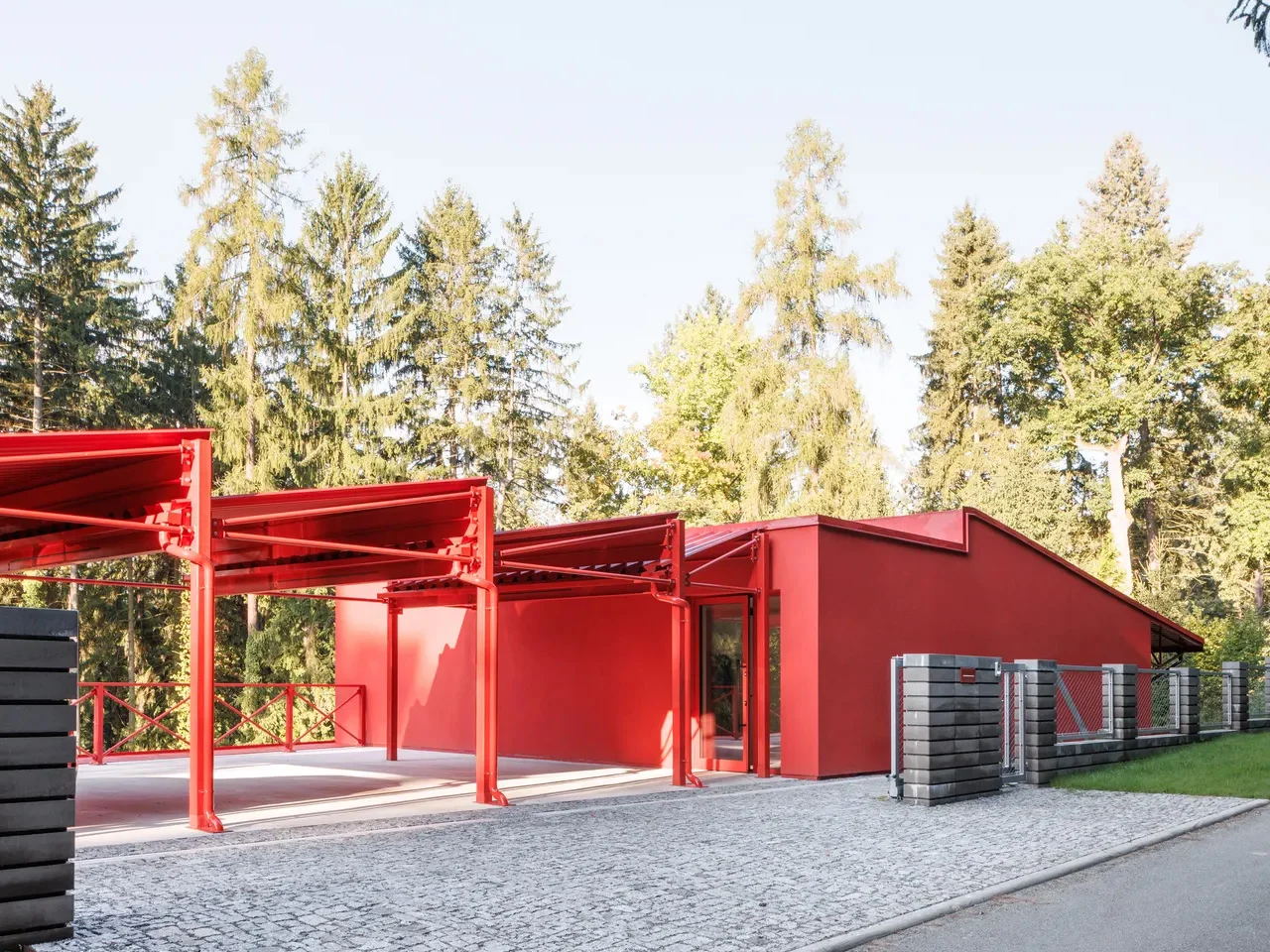 La Villa Jevany est unique en raison de son utilisation audacieuse de l’acier rouge, qui contraste fortement avec le paysage forestier environnant. Contrairement aux maisons forestières typiques construites en bois ou en pierre, ce bâtiment a été conçu pour faire une déclaration visuelle marquante.