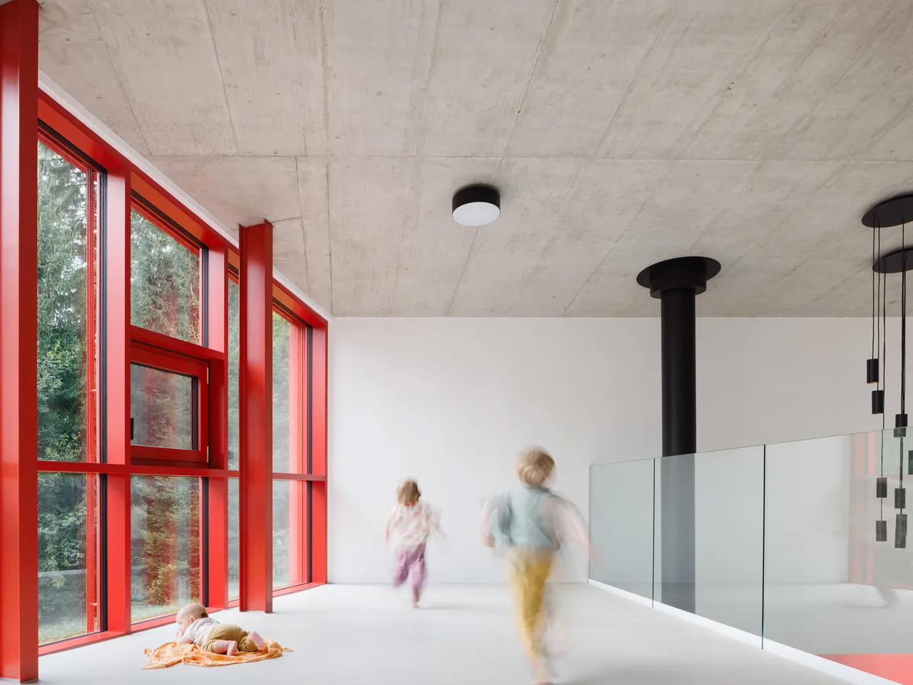 Le choix des couleurs est ancré tant dans la théorie que dans l’instinct. Architektura a utilisé le vert et le rouge comme couleurs complémentaires, s’inspirant de la roue des couleurs et, plus précisément, de l’art abstrait. La vitrification irrégulièrement divisée de la façade rend hommage à Mondrian, créant une tension visuelle entre la géométrie rythmique des fenêtres et la verticalité organique des arbres qui les entourent. De la route, la maison ressemble presque à une toile suspendue dans la forêt ; de l’intérieur, la forêt devient la toile.