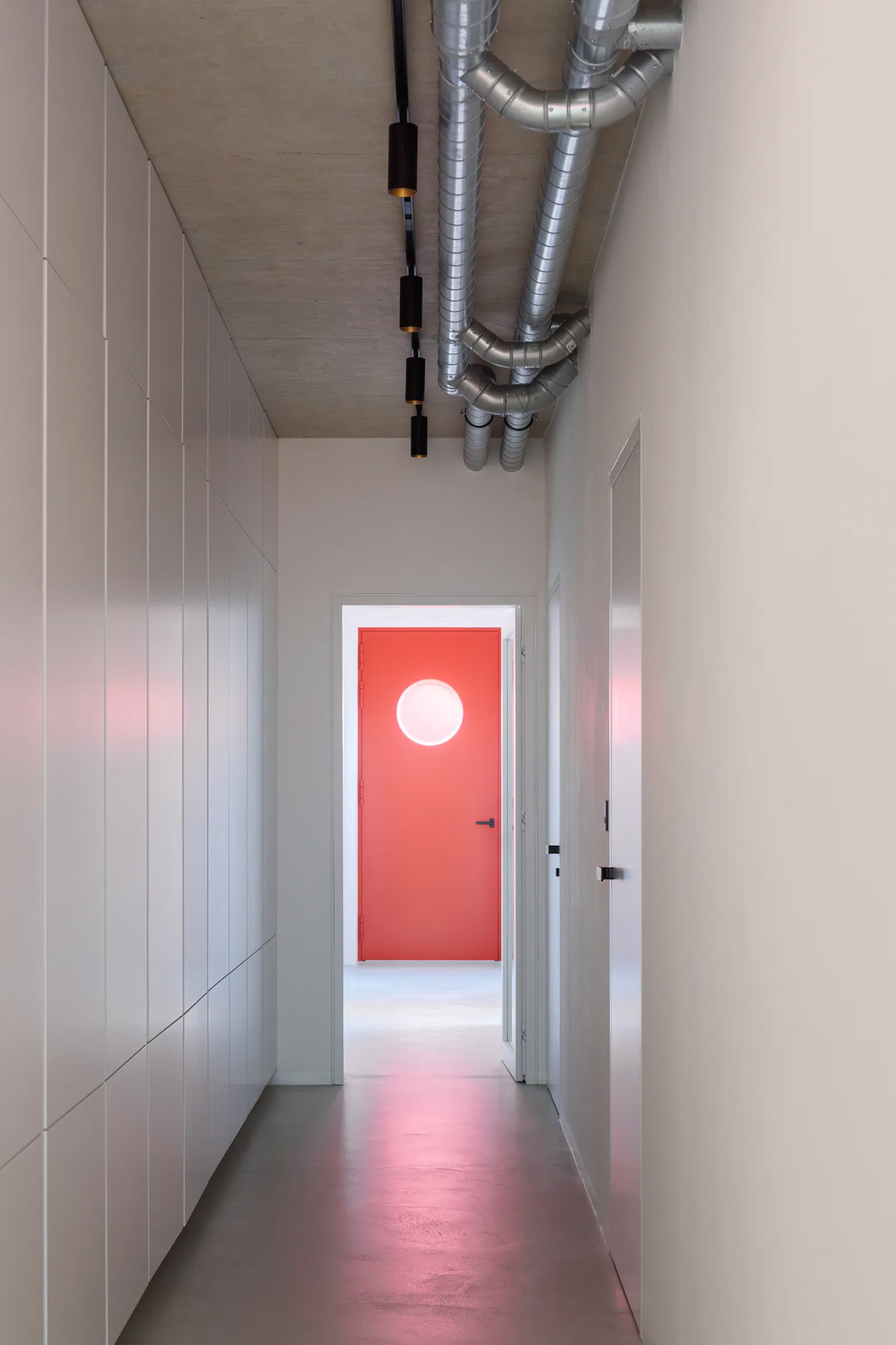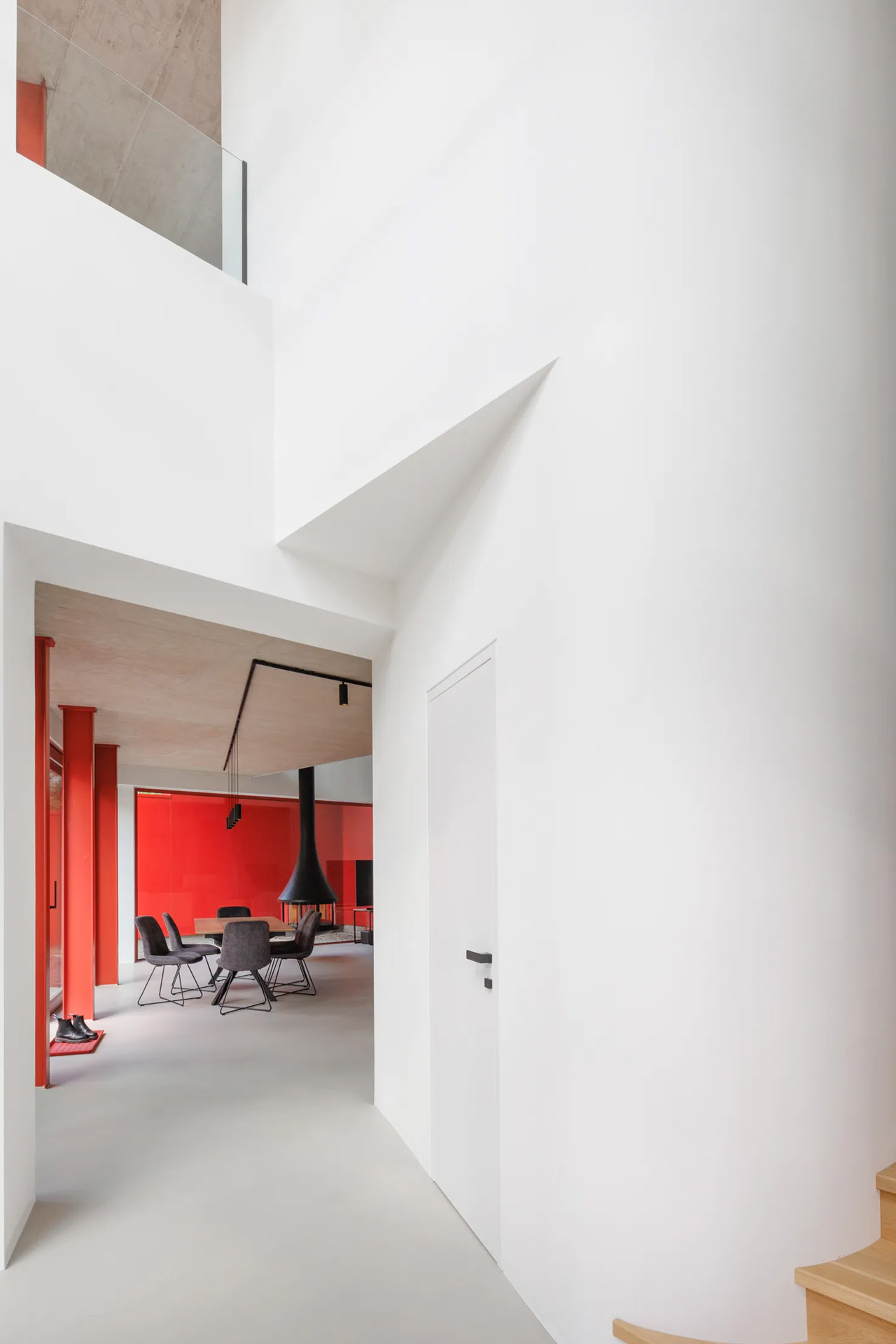 À l’intérieur, l’aménagement se déploie sur cinq niveaux distincts. L’entrée s’ouvre sur un hall avec une hauteur de plafond de 3,5 mètres, où un mur courbé guide les visiteurs vers l’espace de vie principal, que les architectes désignent comme la « zone jour ». Ici, des fenêtres en acier rouge industriel encadrent la verdure environnante ; des murs blancs côtoient des détails noirs ; des comptoirs en pierre rouge ancrent la cuisine, tandis qu’un foyer en acier flottant ajoute une touche contemporaine. Cet espace incarne des contrastes délibérés, fonctionnellement domestique mais brut au niveau de la sensation.