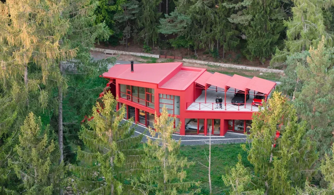 Dans les profondeurs des forêts d’épicéas de Jevany, une municipalité tchèque de moins de 800 habitants située dans la région de Bohême centrale, un éclat de rouge cerise perce la verdure. C’est la Villa Jevany, une nouvelle résidence conçue par le studio local Architektura, qui ne cherche absolument pas à se fondre dans le paysage. Contrairement à la plupart des maisons forestières qui privilégient le bois, la pierre et des tons neutres, Architektura a opté pour un choix audacieux, habillant la structure d’acier rouge vif, un acte de contraste délibéré et sans compromis.