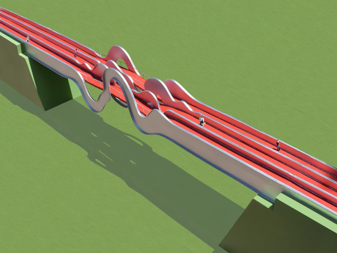 Le plan de base impose quatre canaux en acier qui s’étendent sur toute la longueur du pont, chacun déformé en une forme d’onde différente au milieu de la travée, entrelacés par trois chemins rouges distincts. Les deux chemins extérieurs s’élèvent où les canaux se déforment en vagues, tandis que le chemin central descend. Ce résultat crée un croisement multi-niveaux, permettant aux piétons de surplomber les vagues ou de plonger dans leur creux, leur offrant ainsi des expériences variées tout en traversant la même structure.
