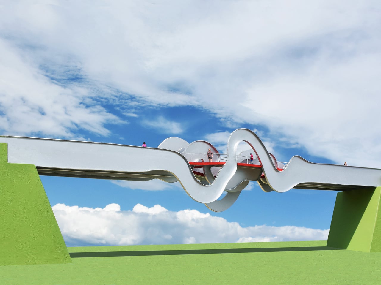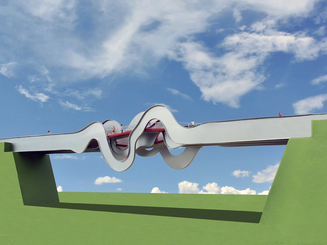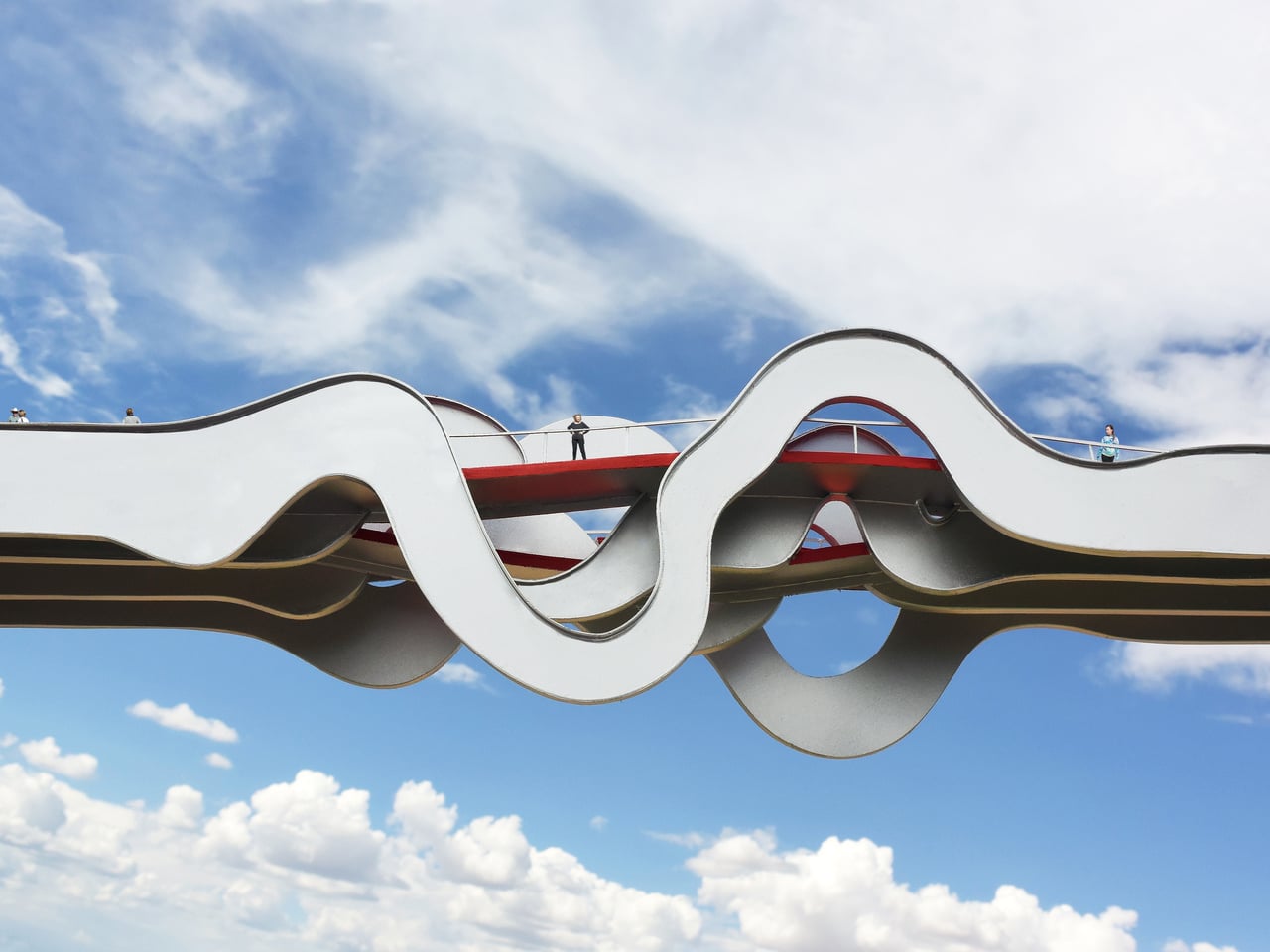Le pont en forme de vagues utilise quatre canaux en acier qui s’étendent sur toute la longueur du pont, chacun déformé en une forme de vague différente au milieu. Trois chemins rouges distincts serpentent à travers eux, créant une traversée à plusieurs niveaux.