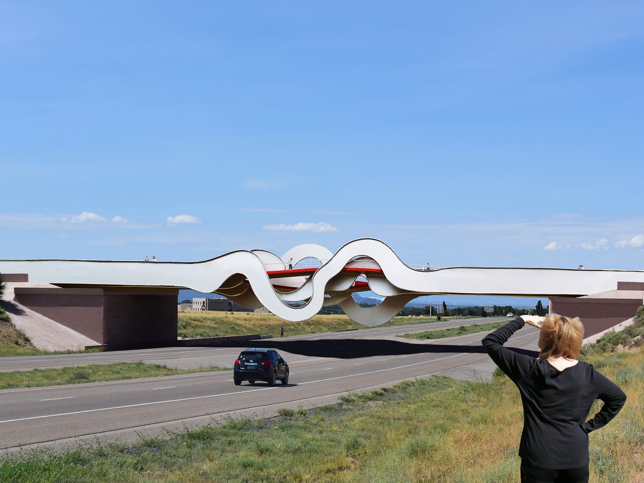 La passerelle en formes d’ondes propose que le pont piéton peut devenir un enregistrement physique du mouvement, une vague d’acier façonnée par les pas de ceux qui la traversent. Au lieu de considérer les personnes comme de simples charges sur un schéma, ce concept les voit comme les auteurs de la forme même. Le passage au-dessus de l’autoroute ne se limite plus à un simple vide à franchir, mais devient une opportunité de transformer le mouvement quotidien en une expérience sculpturale, visible à la fois d’en haut et d’en bas.
