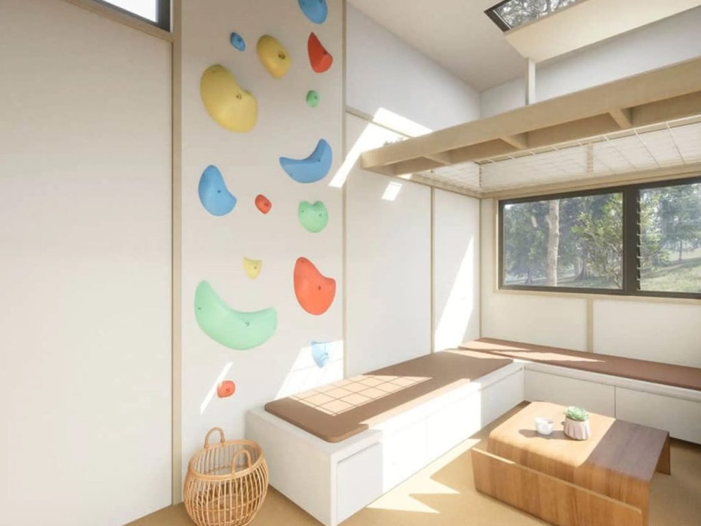 Directement au-dessus du salon se trouve un espace de détente unique avec un sol en filet, semblable à celui utilisé dans le modèle Mina de Baluchon. Ce coin surélevé est accessible grâce à un mur d’escalade intégré, en faisant un lieu ludique pour lire, se relaxer ou simplement se prélasser au-dessus de la pièce principale. Bien que cette conception soit amusante, elle pourrait ne pas convenir à tout le monde ; par exemple, naviguer sur le mur d’escalade en pleine nuit pour accéder à la salle de bain peut s’avérer compliqué. Pour ceux qui préfèrent des options plus classiques, le sol en filet peut être remplacé par un plancher de chambre en loft solide, et le mur d’escalade peut être échangé pour des escaliers standards afin d’améliorer l’accessibilité.