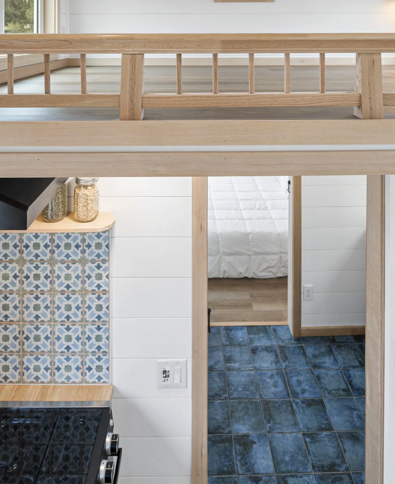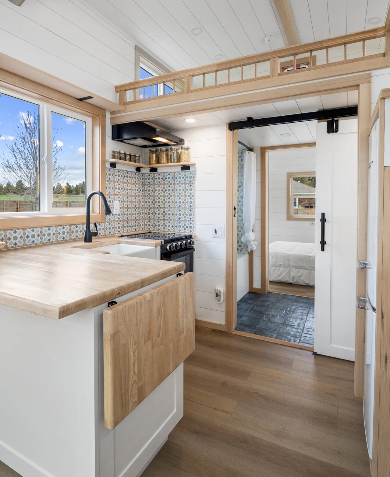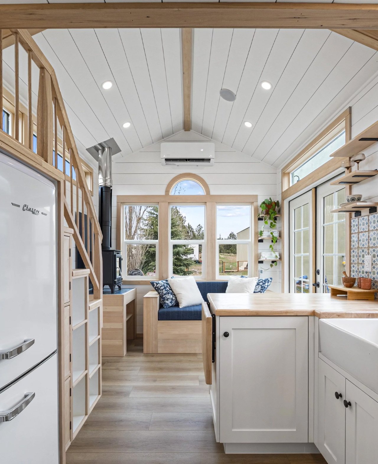 L’intérieur du Shasta allie esthétique moderne et éléments rustiques. Il comporte une chambre au rez-de-chaussée, un espace de couchage en mezzanine, et une cuisine équipée de comptoirs en bois et d’une étagère ouverte. Les fenêtres nombreuses favorisent une luminosité naturelle.