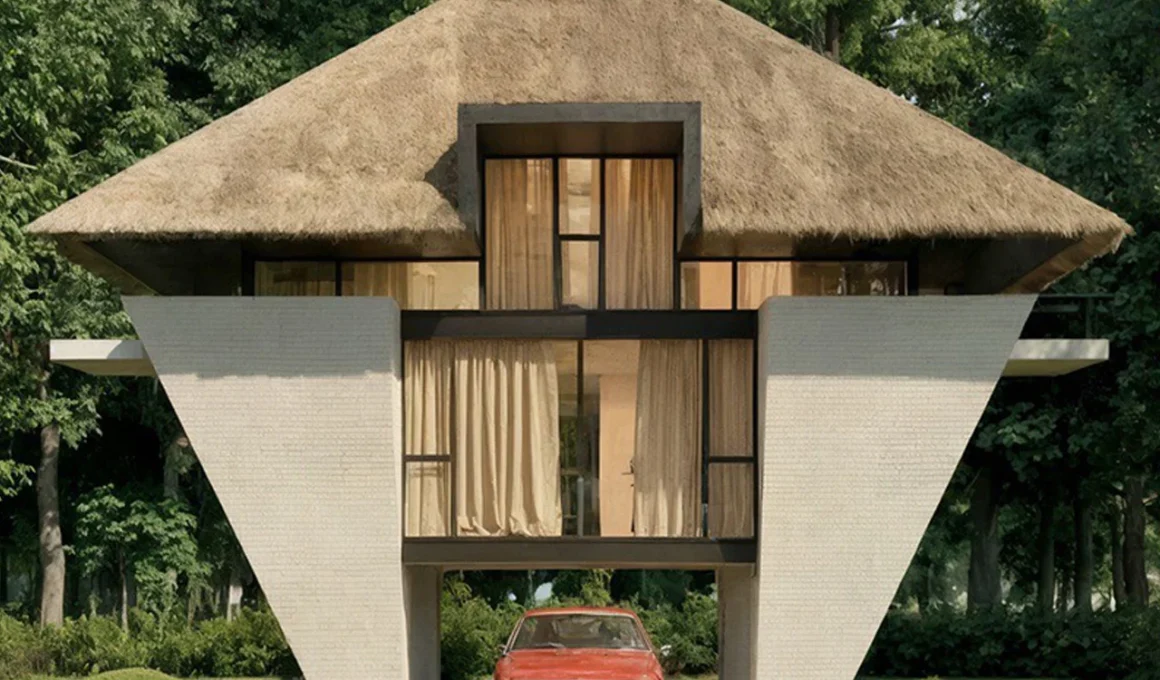 Le toit de la villa, recouvert de paille en chaume, fait appel à la sagesse architecturale vernaculaire. L’utilisation de ce matériau n’est pas uniquement esthétique, mais elle répond également à des besoins climatiques réels. La paille est un excellent isolant, tandis que sa texture contraste avec la précision géométrique des colonnes. Ce toit distinctif confère à la villa une silhouette reconnaissable, reliant les pratiques de construction historiques à des concepts spatiaux contemporains.