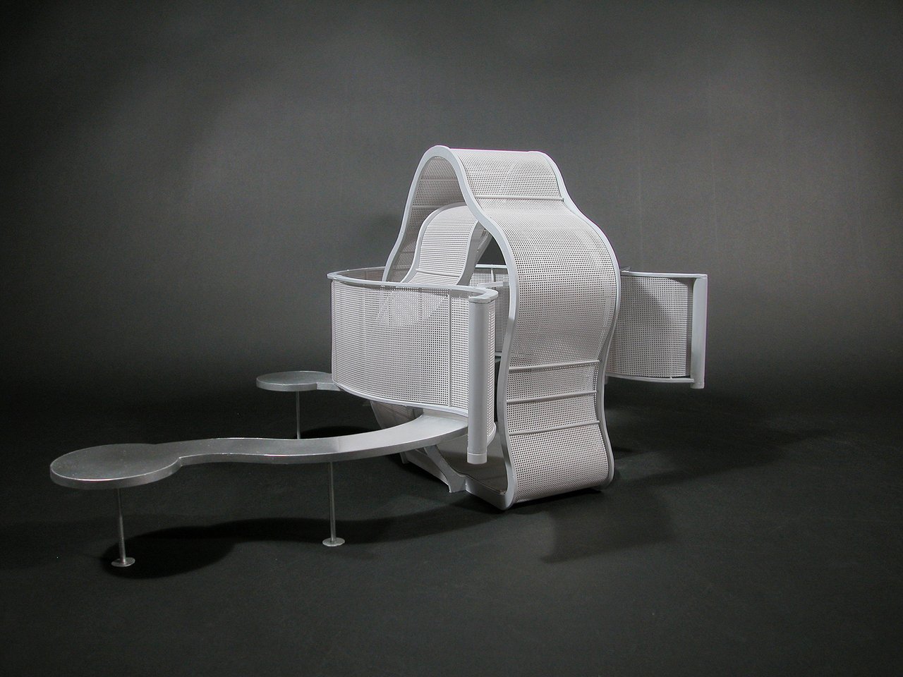 Des surfaces de travail courbées, des étagères intégrées et un cabinet de rangement s’intègrent dans le volume partiellement clos, avec certaines éléments s’étendant vers l’extérieur pour un usage extérieur. Cette relation entre l’intérieur et l’extérieur soutient à la fois les travaux en solo et les activités collaboratives, rendant l’environnement de travail suffisamment flexible pour s’adapter aux besoins variés des tâches au cours de la journée.