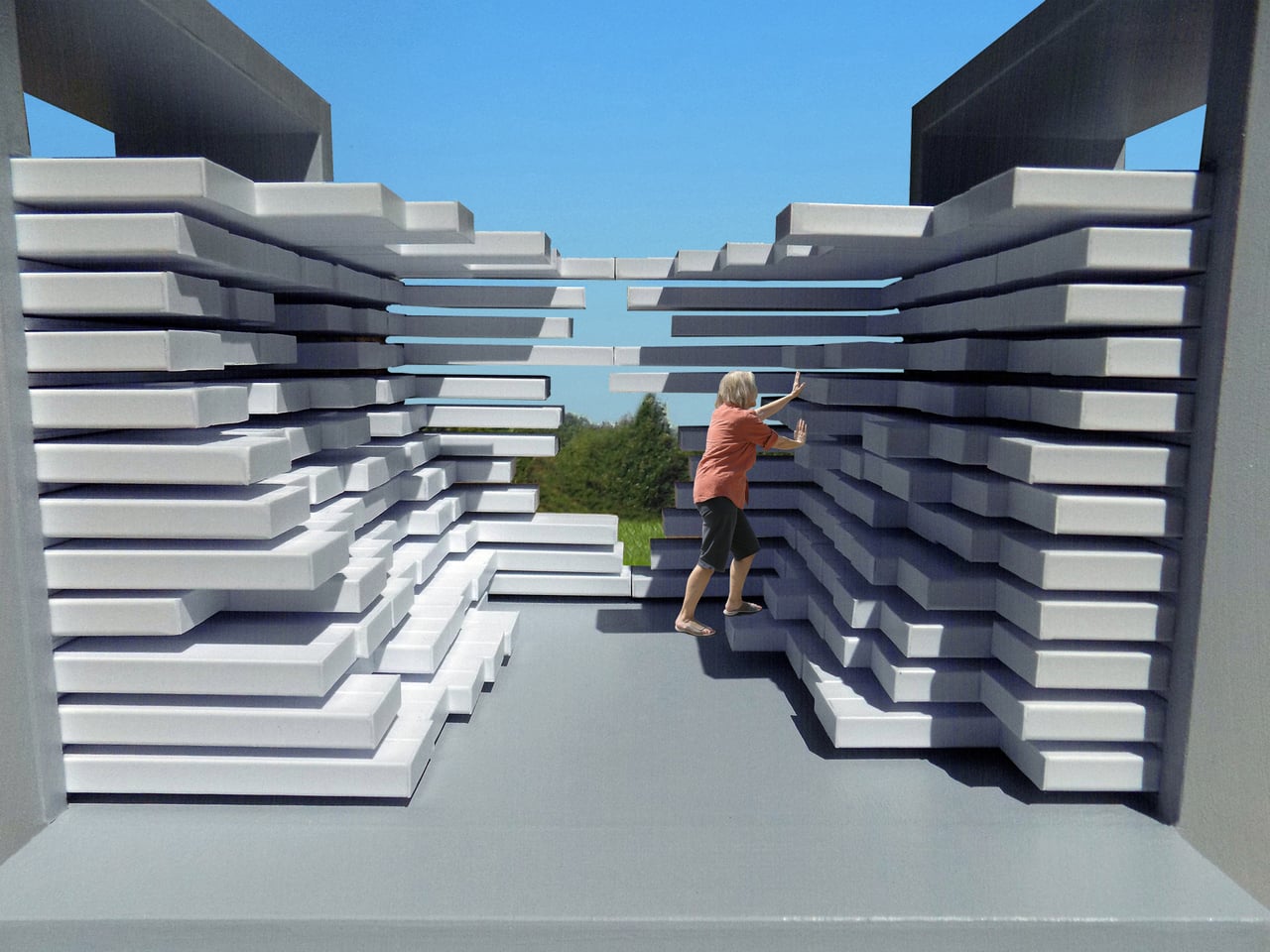 Chaque élément blanc peut glisser indépendamment, permettant aux visiteurs de tirer et de moduler les pièces pour créer des marches, des rebords et des surplombs. Jantzen évoque des configurations allant de la simplicité symétrique à la complexité chaotique, transformant cette structure en tunnel, grotte ou barre solide, selon l’étendue des éléments. L’espace est littéralement sculpté à partir des blocs en temps réel, transformant un objet statique en une machine spatiale réactive.