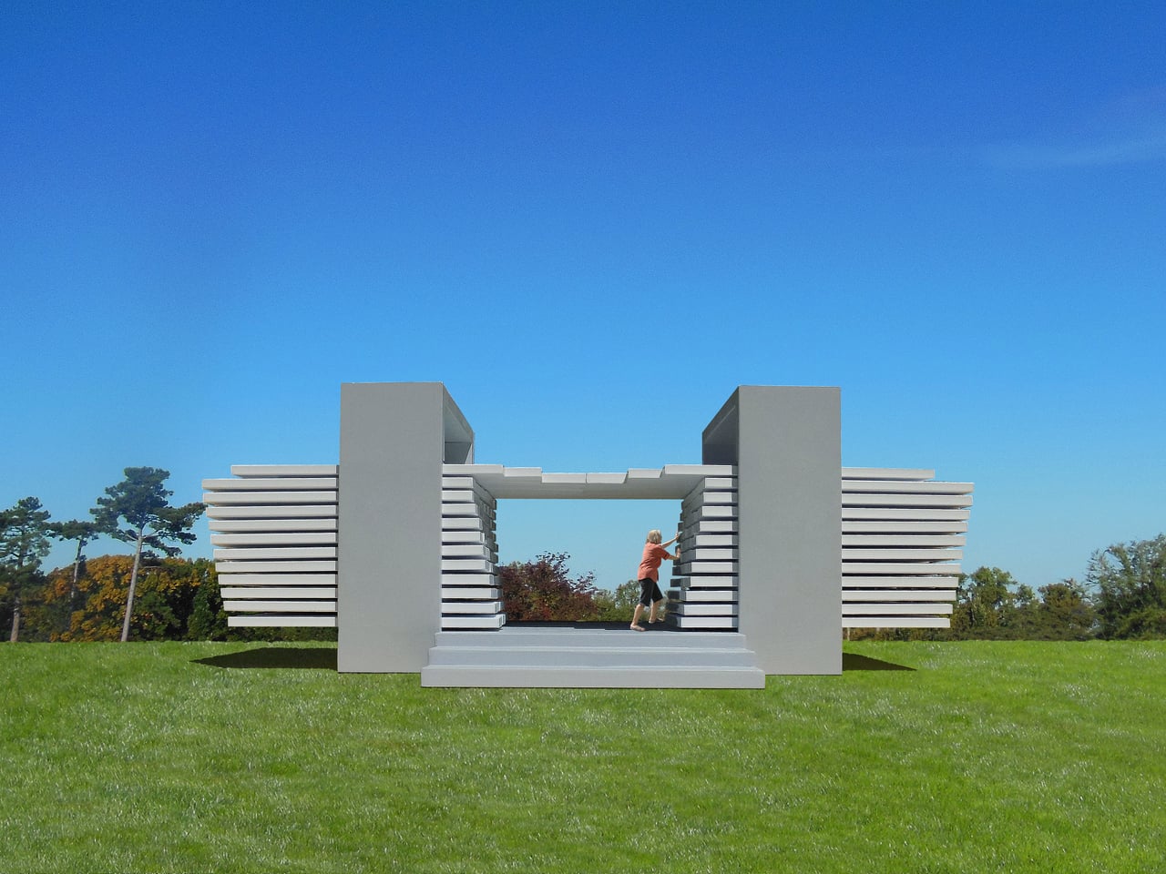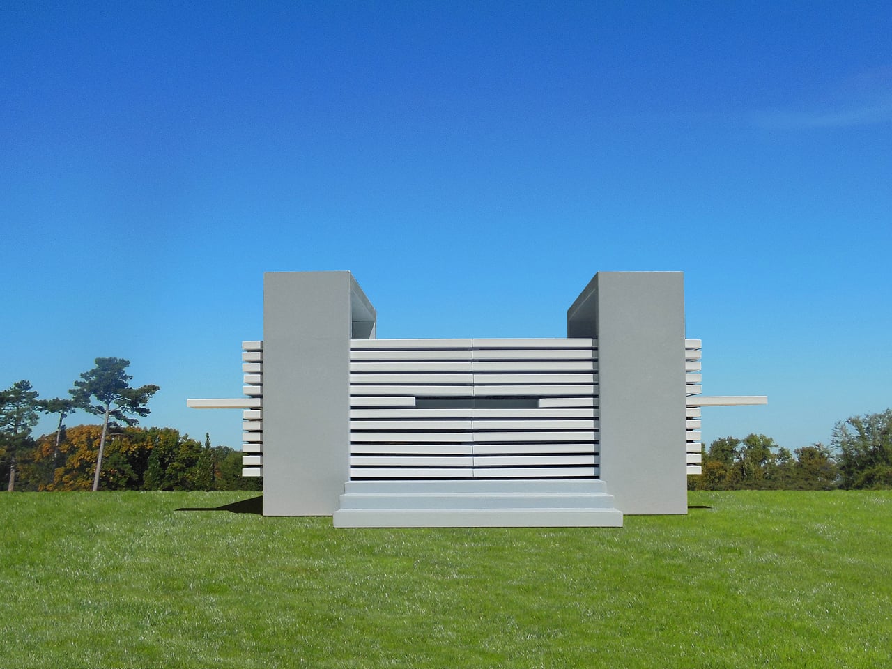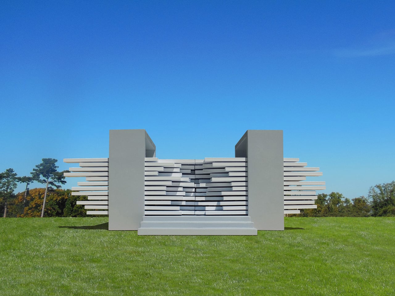 Le Pavillon de l’Espace Malléable se compose d’une structure interactive, conçue à partir d’un kit de pièces simples. Deux colonnes grises se dressent comme supports, tandis que 192 éléments horizontaux blancs, répartis en 96 de chaque côté, sont montés sur des rails. Dans son état par défaut, le pavillon présente deux blocs opposés, avec un canyon étroit les séparant. Ce design évoque davantage une œuvre de land art qu’un bâtiment traditionnel accessible.