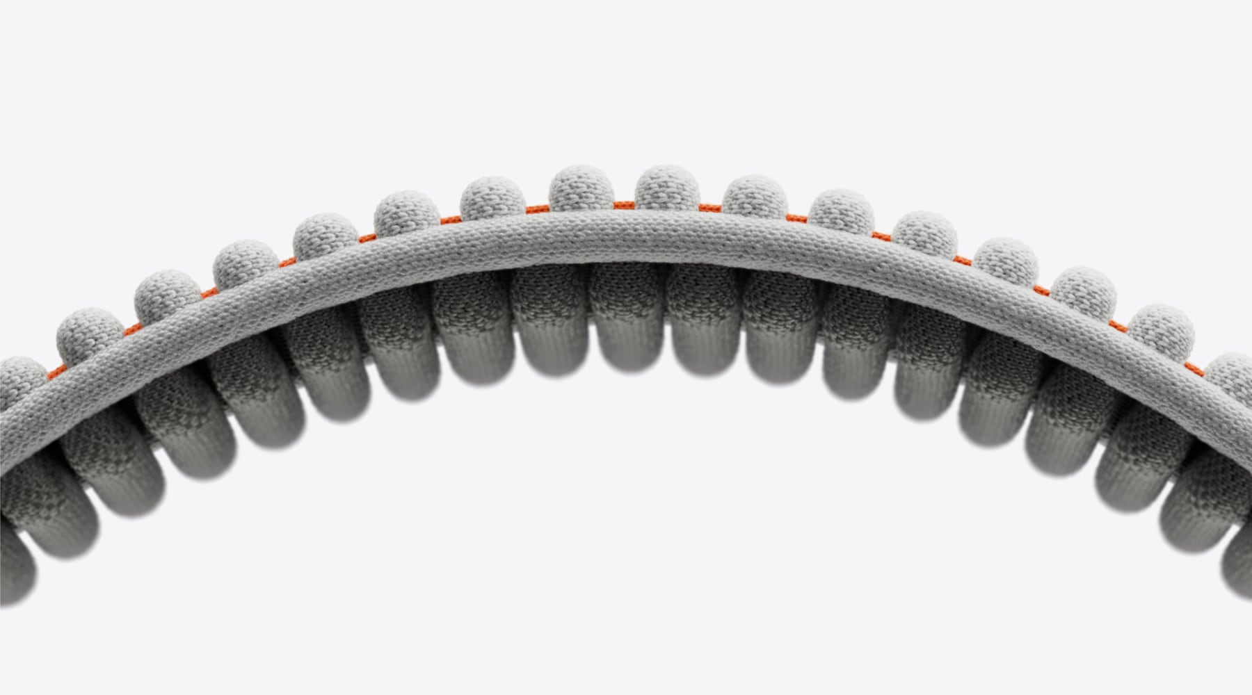 La bande est tricotée en 3D comme une pièce unique, avec des sangles supérieures et inférieures formant une structure à double côte. La sangle inférieure contient des nervures en tissu flexible, renforcées par des inserts en tungstène. Ces contrepoids équilibrent le poids frontal du Vision Pro en ajoutant du poids à l’arrière, créant ainsi un casque stable sans la pression constante des modèles précédents.