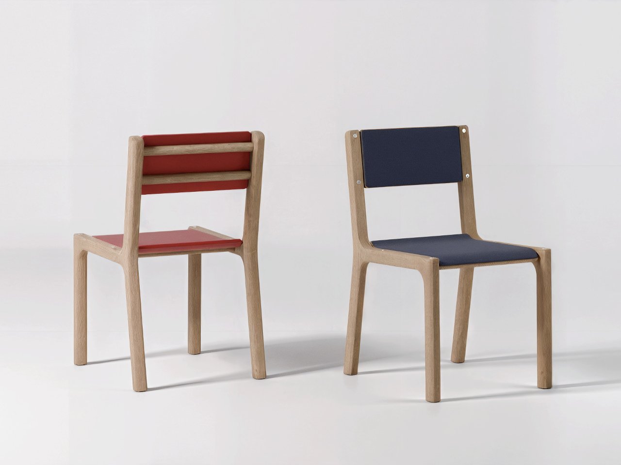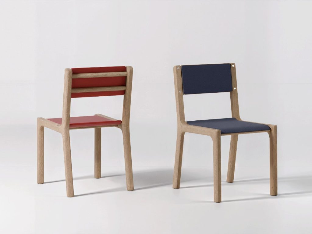 La construction est simple : un cadre en bois courbé ou stratifié forme les jambes et le dos, tandis que des pièces horizontales portent la charge structurelle. Le siège et le dossier sont des panneaux séparés fixés par quatre vis chacun, permettant de les retirer et de les remettre sans endommager le matériau.