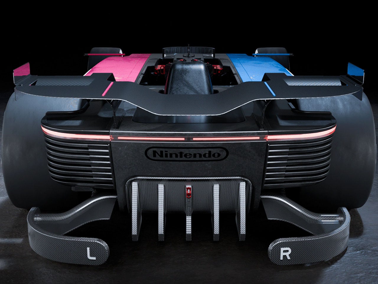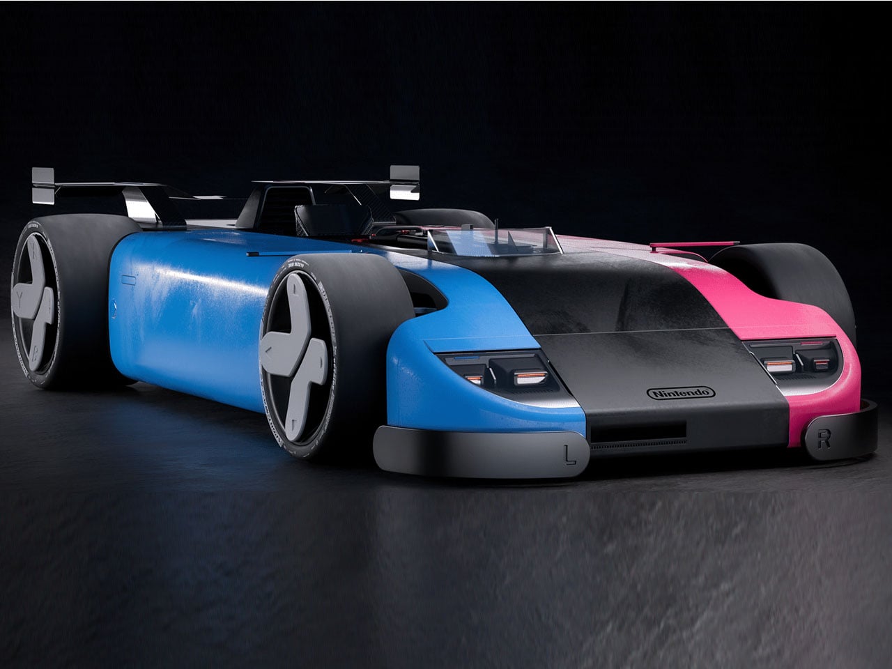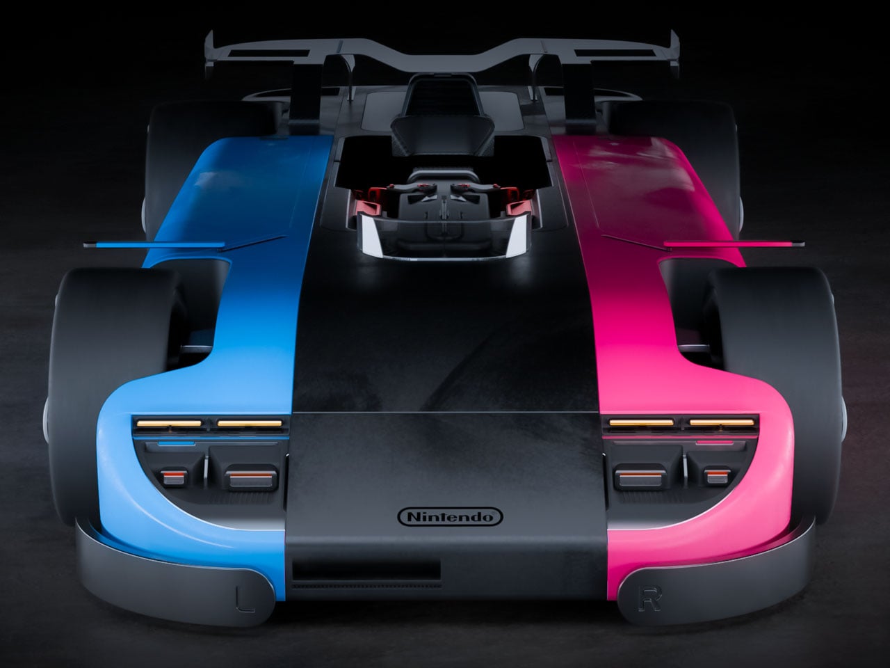 Les concepteurs, Anton Kulakov et Florin Ivan, ont imaginé une esthétique qui évoque immédiatement l’univers de la Nintendo Switch. Les couleurs rouge, noir et blanc dominent la carrosserie, reprenant celles de la console et de ses Joy-Con. Ces couleurs sont appliquées en sections nettes plutôt que dans des dégradés, renforçant l’idée de composants modulaires unis en un tout cohérent. L’auto est basse et large, avec des proportions exagérées qui soulignent la vitesse, l’adhérence et la stabilité, lui donnant une posture visuelle de machine axée sur la piste.