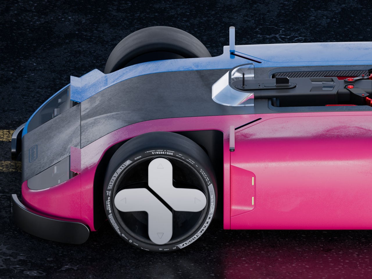 L’intention aérodynamique joue un rôle majeur dans la définition des surfaces de la voiture. Des lignes longues et fluides guident l’œil de l’avant vers l’arrière, tandis que les arches de roue agressives et les panneaux latéraux sculptés suggèrent une gestion fonctionnelle de l’air. L’avant du véhicule est compact et affirmé, avec des éléments d’éclairage intégrés harmonieusement à la carrosserie, évitant d’être perçus comme des composants séparés. Chaque angle du design trouve un équilibre entre une géométrie nette et des transitions douces, imitant la manière dont le matériel de jeu combine des formes angulaires avec des courbes ergonomiques.