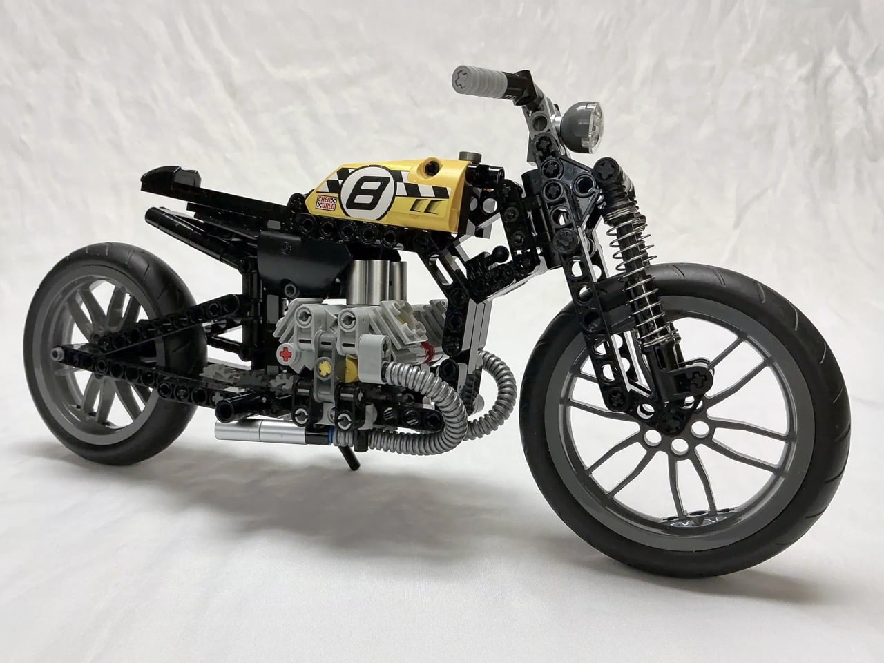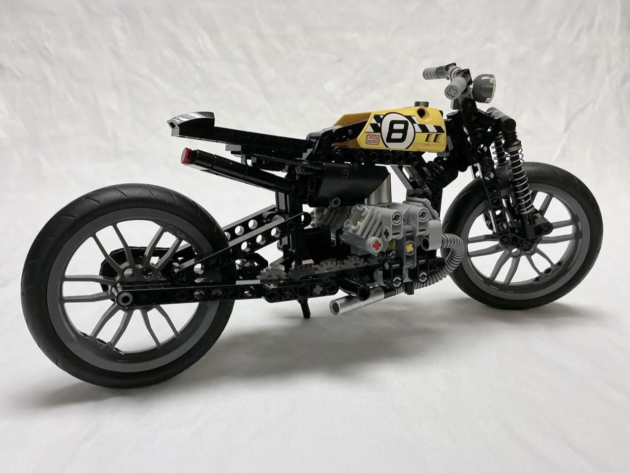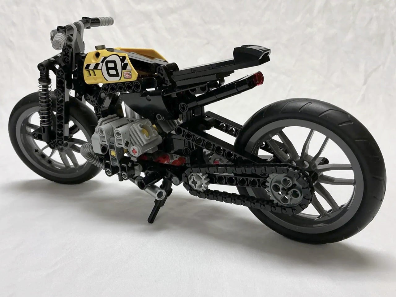 Les bobbers ont vu le jour dans les garages américains d’après-guerre, lorsque les motards ont commencé à enlever tout ce qui était superflu de leurs motos. La philosophie était simple : perdre le poids supplémentaire tout en conservant ce qui fait fonctionner la moto. Cette version LEGO reflète cet esprit avec son moteur bicylindre exposé, son cadre minimaliste et son réservoir de course jaune affichant le numéro 8 en gras. Le constructeur a modifié le set LEGO Technic 42036 pour en faire quelque chose de beaucoup plus léger et spécialisé, remplaçant les composants de suspension d’origine par ces astucieux ressorts de stylo et repositionnant des éléments pour obtenir de bonnes proportions de bobber.