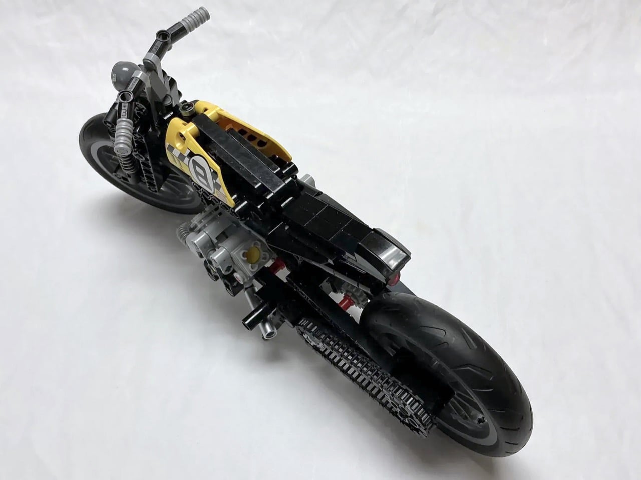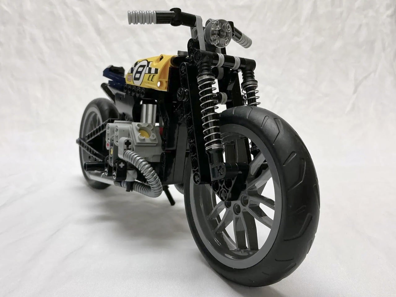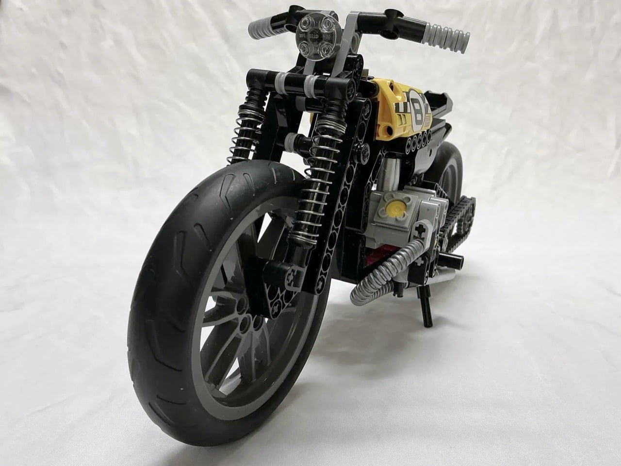 Les bobbers ont vu le jour dans les garages américains d’après-guerre, lorsque les motards ont commencé à enlever tout ce qui était superflu de leurs motos. La philosophie était simple : perdre le poids supplémentaire tout en conservant ce qui fait fonctionner la moto. Cette version LEGO reflète cet esprit avec son moteur bicylindre exposé, son cadre minimaliste et son réservoir de course jaune affichant le numéro 8 en gras. Le constructeur a modifié le set LEGO Technic 42036 pour en faire quelque chose de beaucoup plus léger et spécialisé, remplaçant les composants de suspension d’origine par ces astucieux ressorts de stylo et repositionnant des éléments pour obtenir de bonnes proportions de bobber.
