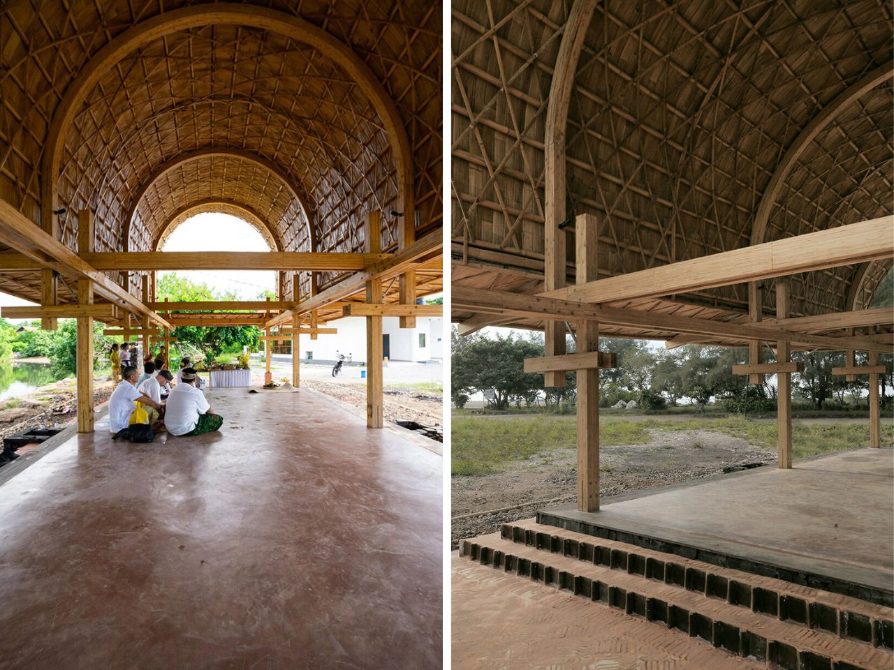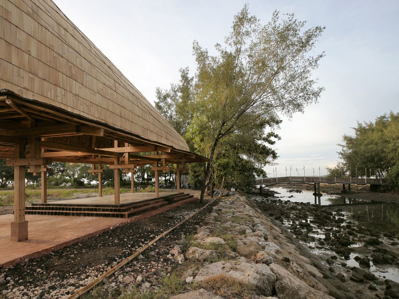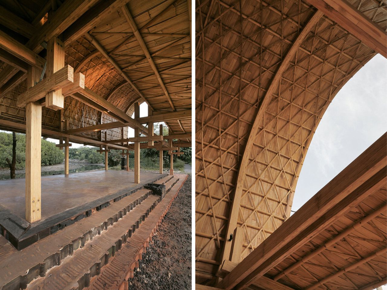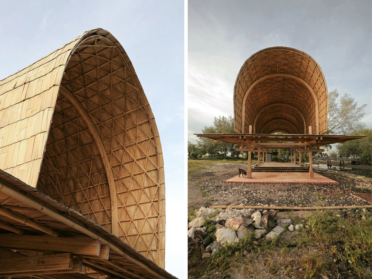 Le toit en arc élégant du pavillon, s’élevant à 8,5 mètres au-dessus de la plage, est à la fois une déclaration visuelle et un exploit fonctionnel. Construit à partir de fines poutres en bambou, recouvert de pelupuh (bambou aplati), le canopy favorise la ventilation naturelle et le refroidissement passif. Sous cette forme organique se trouve une structure en bambou petung, localement sourcée, liée par résine, et compressée pour atteindre la solidité et la précision de l’acier ou du bois, mais sans leur coût carbone élevé.