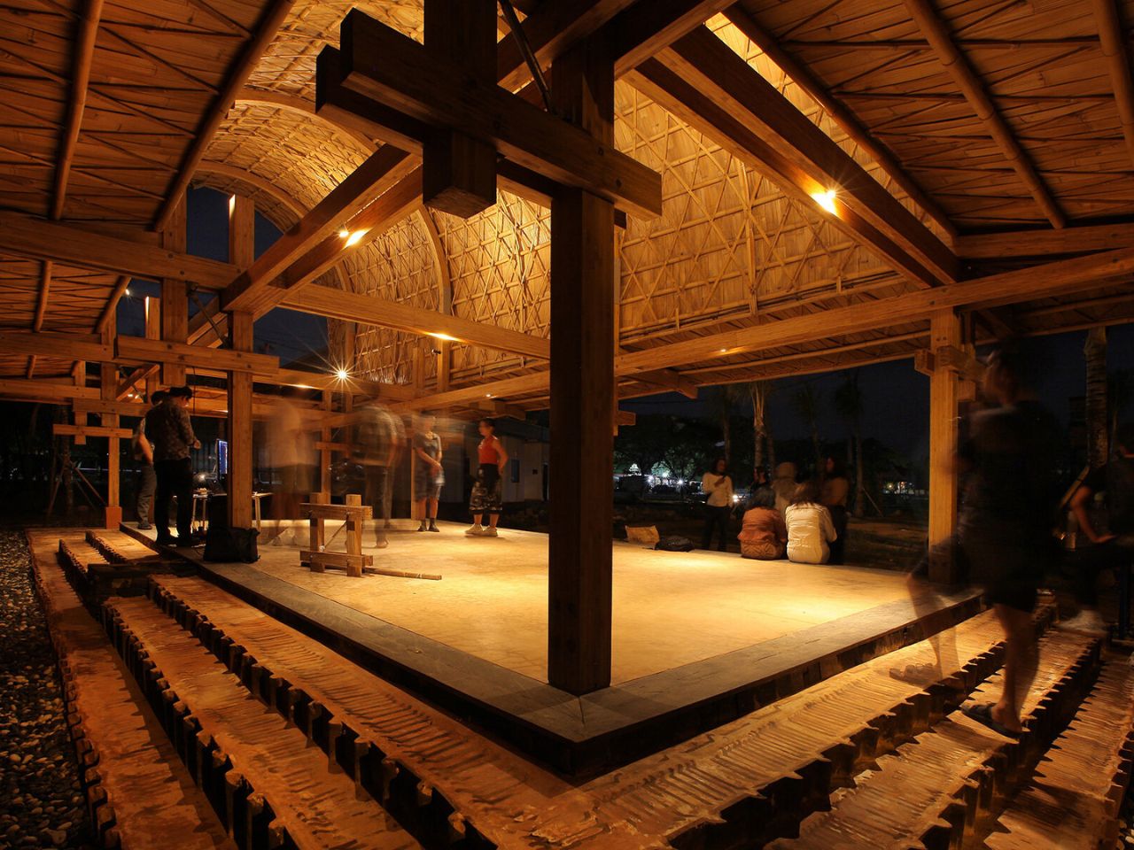 Tous les éléments du pavillon ont été cultivés, traités et assemblés en Indonésie. Les matériaux comprennent du bambou, des roches volcaniques locales, et des tuiles en terre cuite réutilisées, formant un système de construction cohérent et durable.
