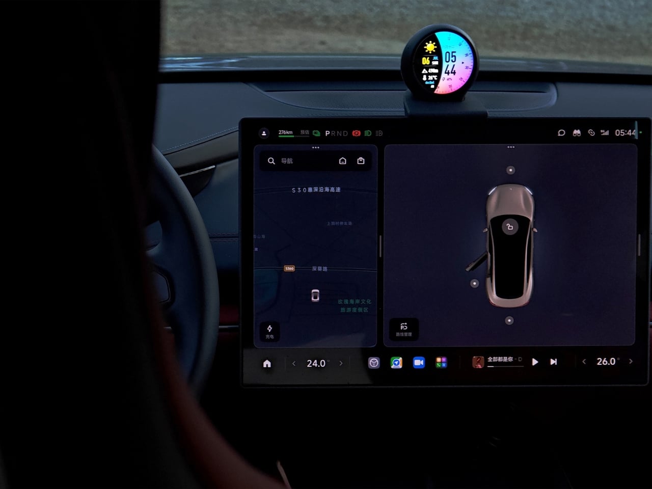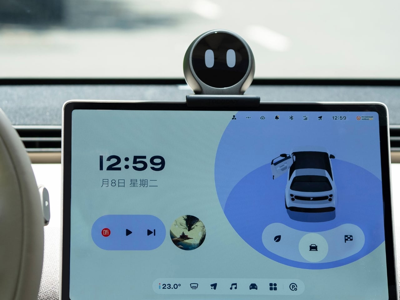 L’écran circulaire de TOOOONY, qui fait également office de hub d’information, peut afficher différents cadrans personnalisables. Que ce soit pour montrer la météo, afficher vos statistiques de véhicule, ou simplement vous offrir des yeux de cartoon pour illuminer un embouteillage, l’écran s’adapte à divers contextes. Vous pouvez y voir des informations de navigation ou contrôler votre musique tout en ayant un compagnon visuel pendant votre trajet.