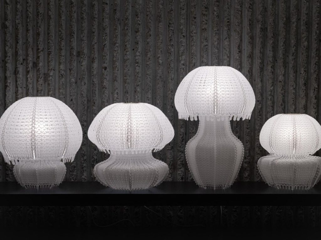 La magie des lampes Polycycle Illumination commence par leur silhouette inspirée des méduses. Chaque abat-jour est conçu à l’aide d’un design paramétrique avancé, où des algorithmes originaux génèrent des formes douces et flottantes qui rappellent les méduses, victimes des déchets plastiques. Les abat-jours sont réalisés à partir d’unités tricotées et entrelacées, à la fois tropicalisables et robustes, alliant précision informatique et savoir-faire artisanal.