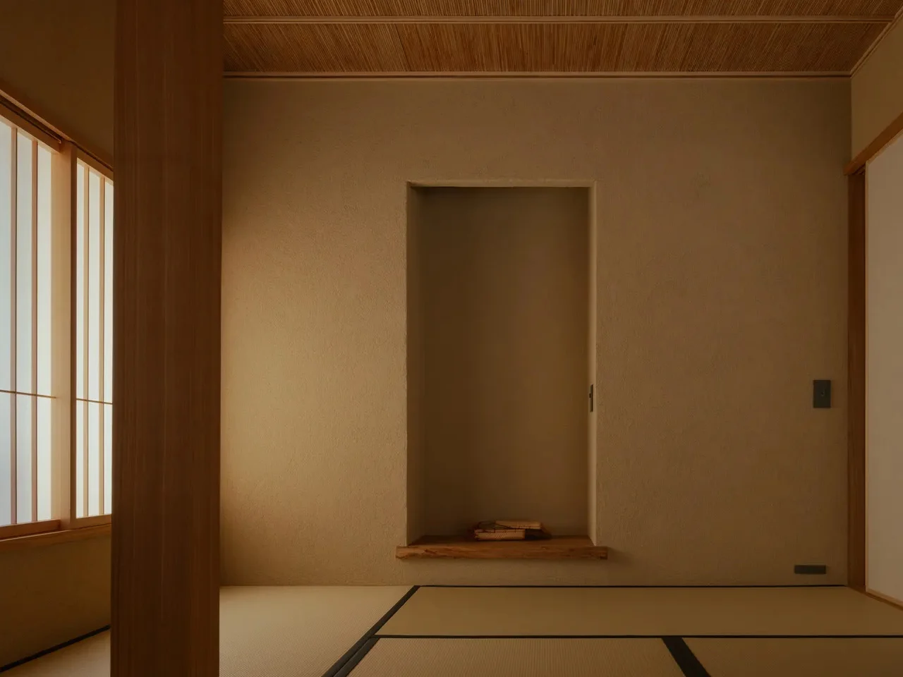 Les choix de matériaux renforcent le lien avec la tradition Sukiya sans recourir à sa simple reproduction. Des poutres en bois de cerisier apparentes traversent les intérieurs. Les murs et plafonds sont recouverts d’un plâtre Juraku, associé à l’identité architecturale de Kyoto. Les portes coulissantes Fusuma, fabriquées par le Noda Hanga Studio, séparent les espaces, et tout ce travail a été exécuté par des artisans locaux, loin des entrepreneurs standardisés.