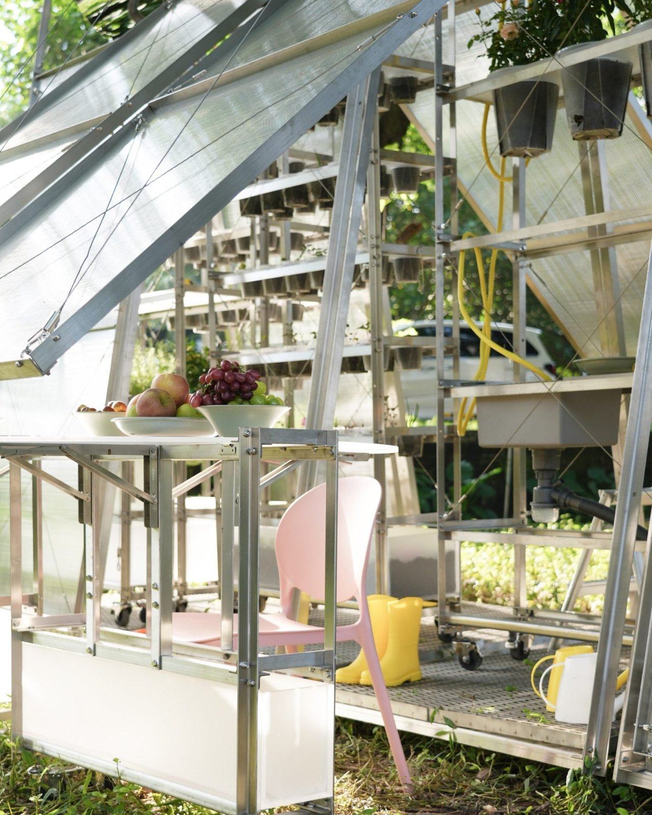Imaginez une structure en acier en forme de A, recouverte de panneaux en polycarbonate pouvant s’ouvrir grâce à des câbles de tension suspendus à son sommet. Lorsque les côtés sont fermés, vous avez un microclimat idéal pour cultiver des pommes de terre, des poivrons, de la laitue, du bok choy et diverses herbes. En tirant sur ces câbles pour relever les murs, vous obtenez instantanément un pavillon aéré prêt à accueillir un dîner ou un atelier communautaire.