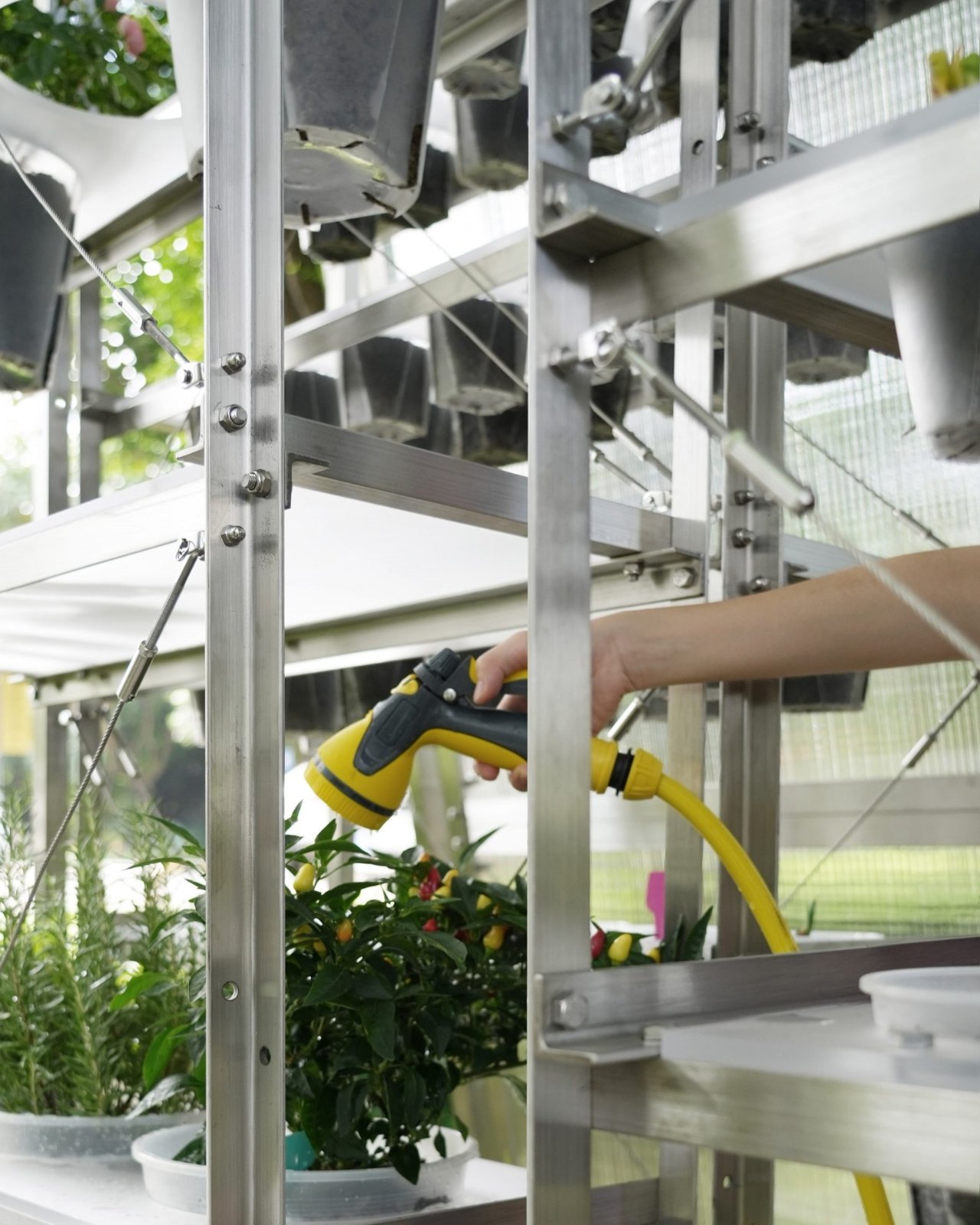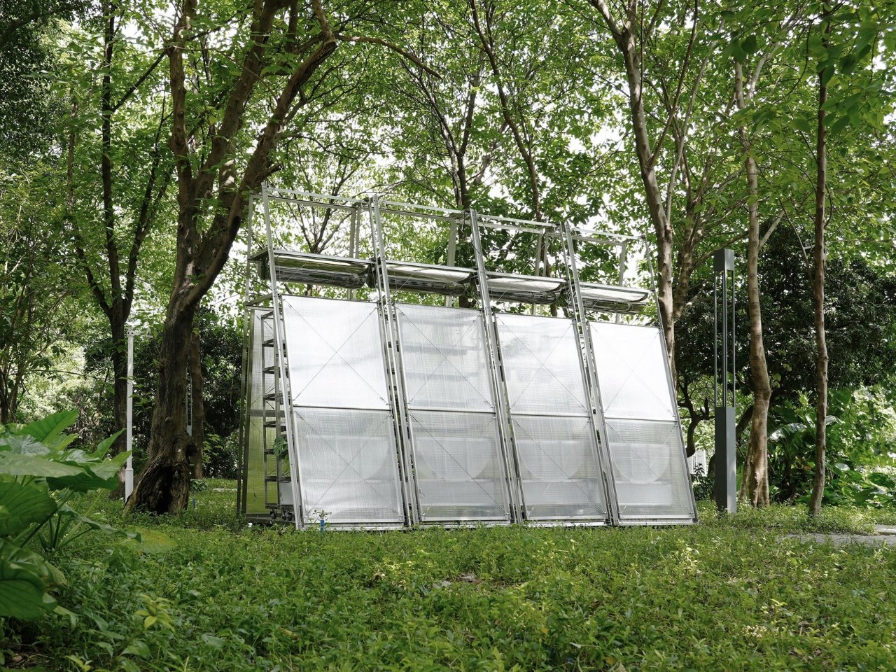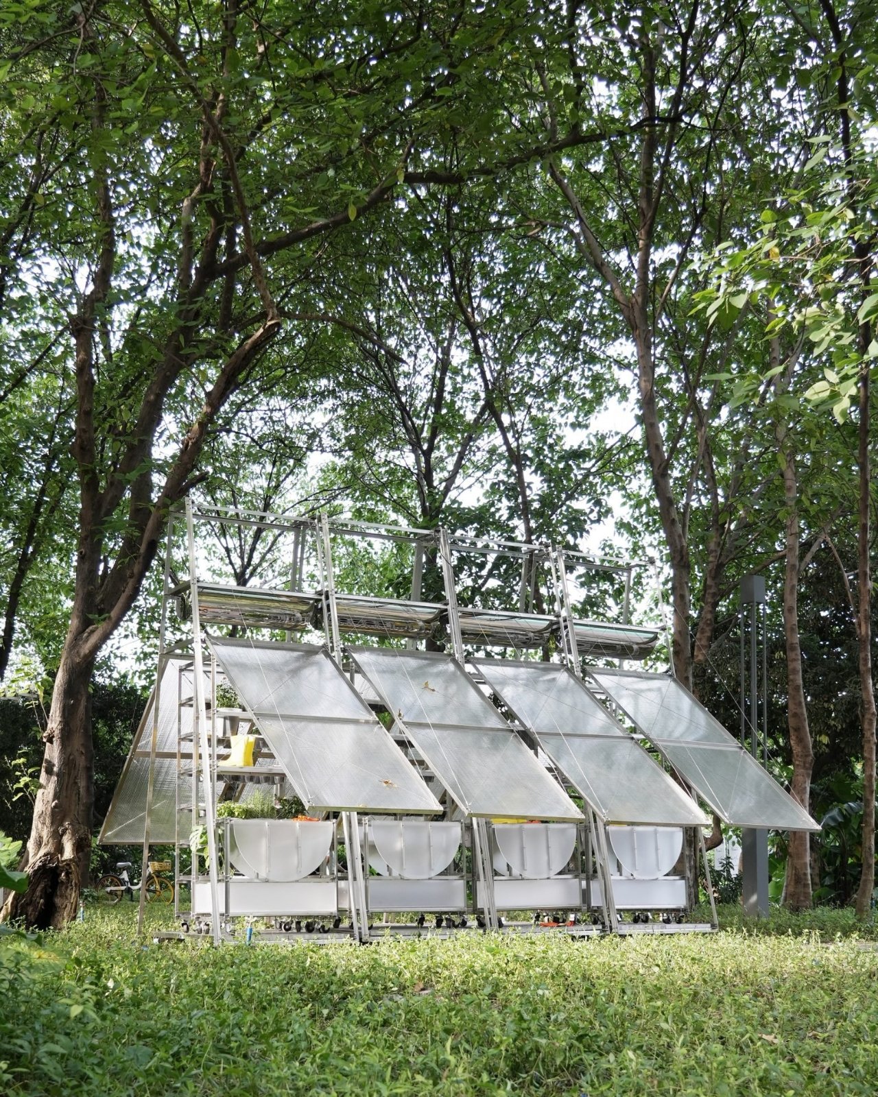Les panneaux en polycarbonate ne sont pas placés au hasard. Les designers ont soigneusement positionné des ouvertures entre ces panneaux pour permettre un refroidissement passif, essentiel dans le climat subtropical de Guangzhou. Personne ne veut se retrouver dans une serre étouffante lorsqu’on s’occupe de ses herbes ou lorsqu’on accueille un rassemblement. À l’intérieur, des étagères métalliques accueillent les légumes et les herbes, créant ainsi un système de culture pratique sans compromettre l’esthétique. La structure entière est légère et modulaire, ce qui permet de l’adapter, de la déplacer ou de la reconfigurer selon les besoins de la communauté.