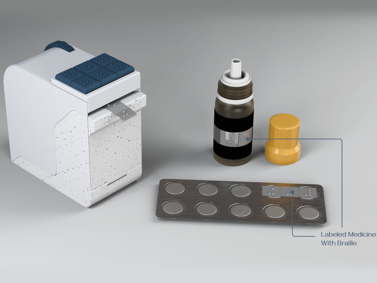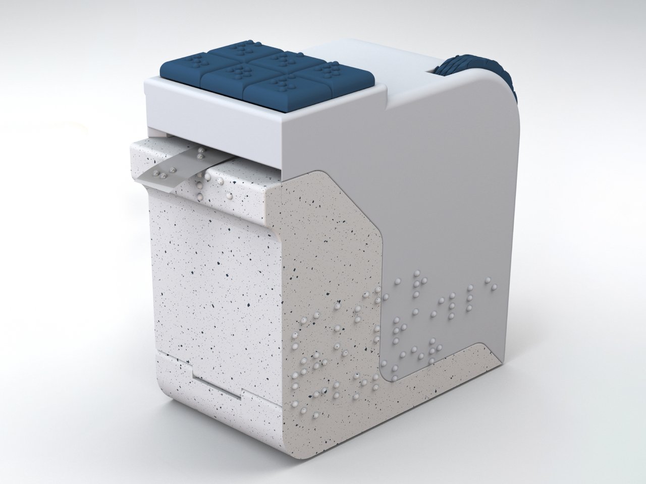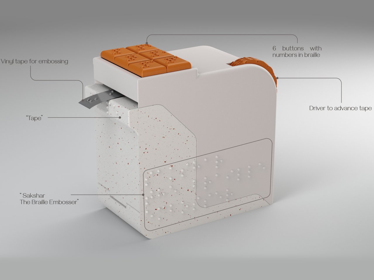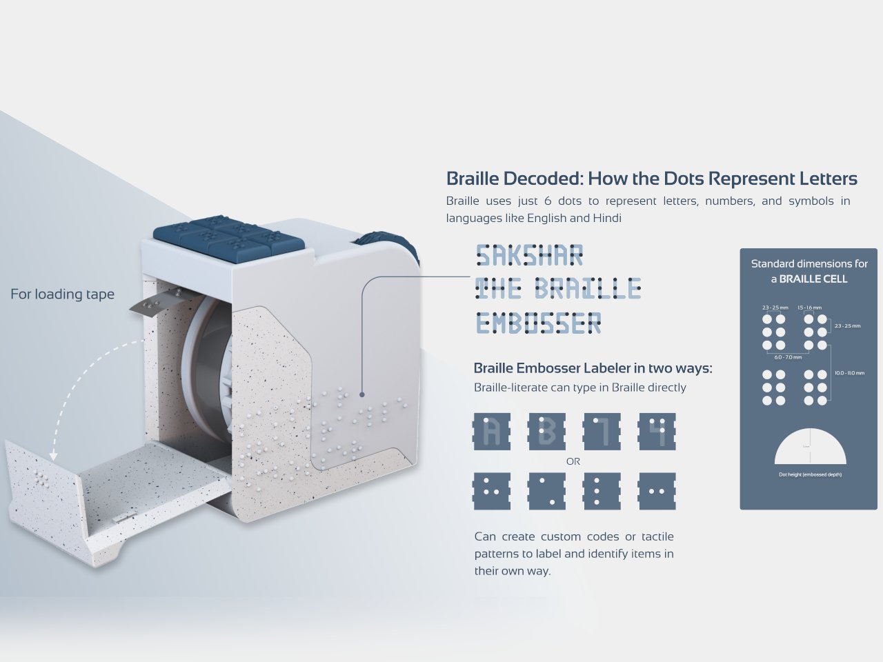 Le concept d’embosseur braille Sakshar est un dispositif mécanique conçu pour créer des étiquettes braille de manière intuitive et accessible, permettant aux personnes malvoyantes d’identifier facilement des objets du quotidien.