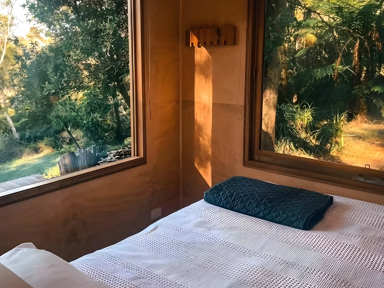 La salle de bain est entièrement équipée, comprenant une douche en verre, un lavabo et des toilettes qui s’intègrent harmonieusement dans le langage matériel global. Un poêle à bois près de l’entrée ajoute de la chaleur, tout en évoquant le côté chaleureux du contreplaqué et du bois franc. L’extérieur en zinc-aluminium résiste aux intempéries tout en nécessitant peu d’entretien, et les options de couleurs Colorbond permettent un ajustement esthétique au site. En outre, la cabane est entièrement autonome, ce qui lui permet de se démarquer qu’elle soit située sur un terrain rural isolé ou dans un vignoble en activité.