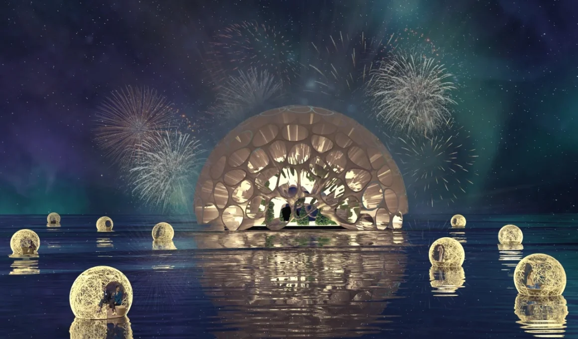 L’extérieur regroupe tous ces éléments. Une grande structure en dôme se trouve directement sur l’eau, sa peau formée de cellules interlocking en forme de bulles qui brillent de l’intérieur. Des pods sphériques plus petits flottent sur la surface autour de lui. En le regardant sous un ciel illuminé par les aurores boréales, il ressemble davantage à une station de recherche sur une autre planète qu’à un siège social d’entreprise.