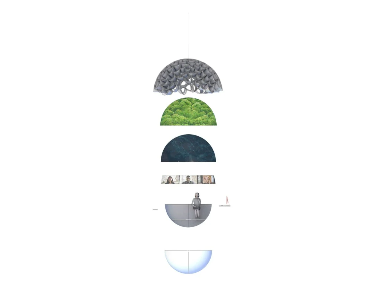 Les pods de travail sont l’endroit où le concept devient le plus sculptural. Des formes sphériques recouvertes de mousse vivante flottent à travers un plan d’étage ouvert, chacune émettant une lueur provenant d’une bande lumineuse autour de son milieu, semblable à une planète vue depuis l’espace. Les travailleurs s’y glissent. Le plafond au-dessus d’eux ondule avec de l’eau projetée. Cela ressemble moins à un bureau qu’à un écosystème dans lequel vous avez la chance de travailler.