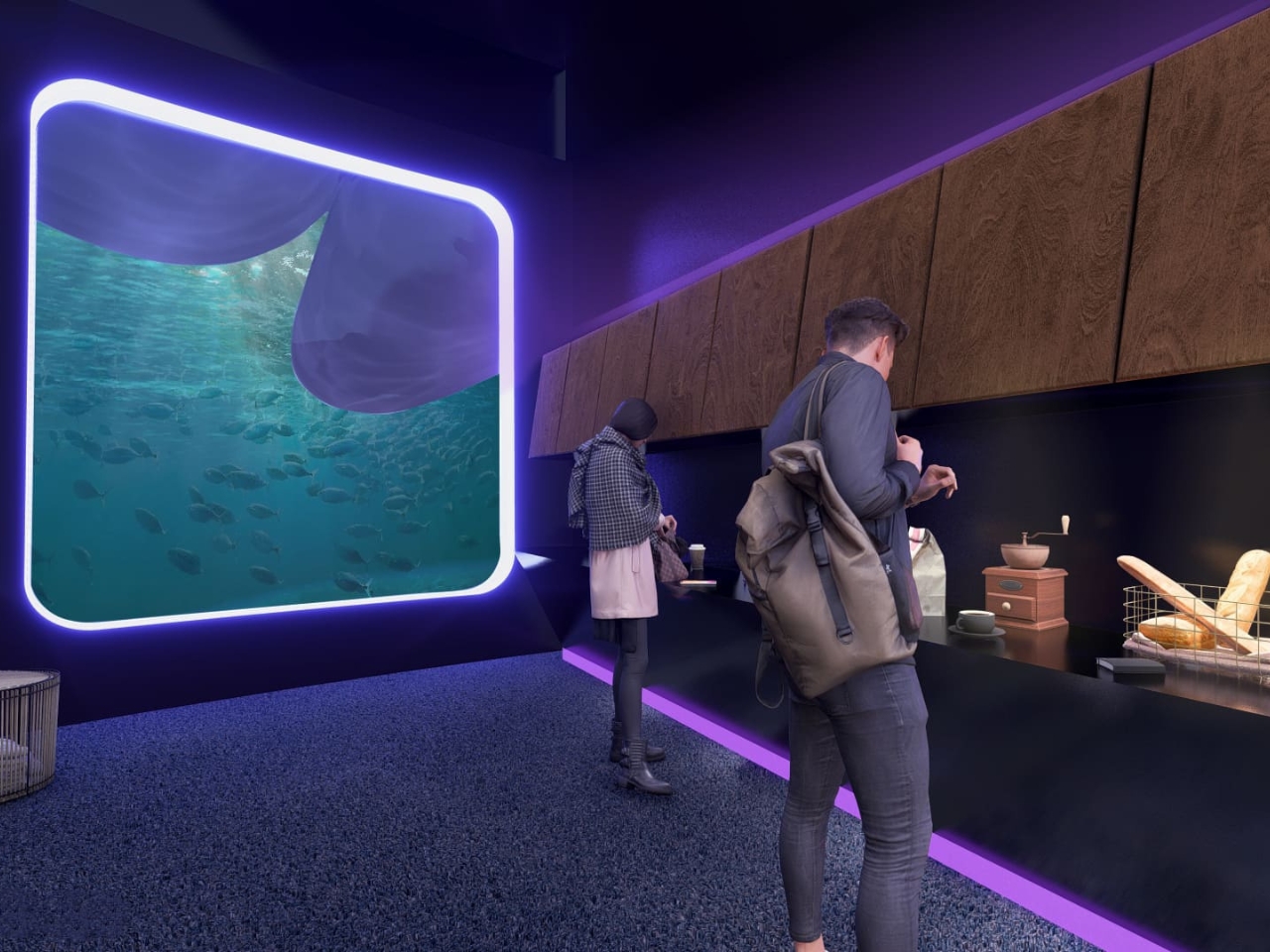 Le design utilise des écrans panoramiques courbés affichant des images de la vie marine, créant une atmosphère immersive qui relie l’environnement des serveurs aux paysages océaniques.