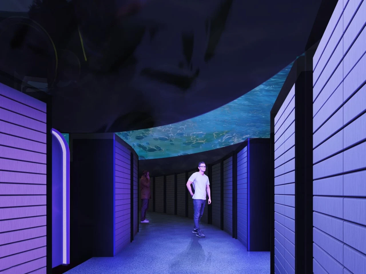 La première chose qui attire l’attention lorsque l’on regarde les rendus concepts, c’est l’océan. Pas au sens métaphorique. Le langage visuel du bâtiment est construit autour du monde visuel des profondeurs marines. Des écrans panoramiques courbés enveloppent les pièces, montrant des baleines beluga glissant à travers les eaux bleues. Des enfants s’assoient au sol d’un espace théâtral immersif, entourés d’une vie marine projetée à grande échelle. Dans le couloir des serveurs, où des racks de matériel s’alignent de part et d’autre d’un étroit couloir, le plafond s’ouvre en un écran courbé de poissons nageant, comme si l’infrastructure sous la surface de l’océan et l’océan lui-même s’étaient fondus en un seul espace.