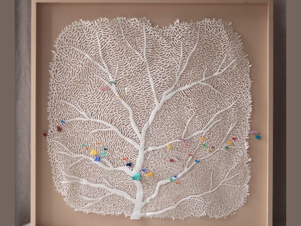 "Plasticum" confronte de manière directe la menace invisible mais omniprésente de la pollution plastique. Cette série met en juxtaposition la beauté inhérente des écosystèmes marins et leur vulnérabilité alarmante face à l’impact humain. Brecevic découpe avec minutie des silhouettes de coraux blanchis et de gorgoniens, également connus sous le nom de fans de mer. Ces formes en papier, évoquant une vie marine fragile, sont ensuite ornées de "baubles," qui ressemblent cruellement aux débris plastiques.