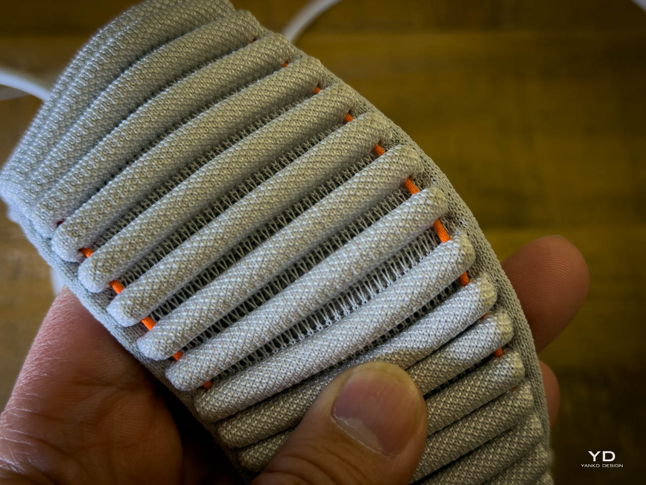 Le « Dual Knit Band » représente un élément central au sein de l’architecture du casque. Ce bandeau introduit une géométrie à deux sangles, tricotées en une seule pièce afin de former une structure à deux nervures. L’une de ces sangles maintient l’arrière de la tête tandis que l’autre se positionne sur le sommet, permettant une répartition optimale du poids.