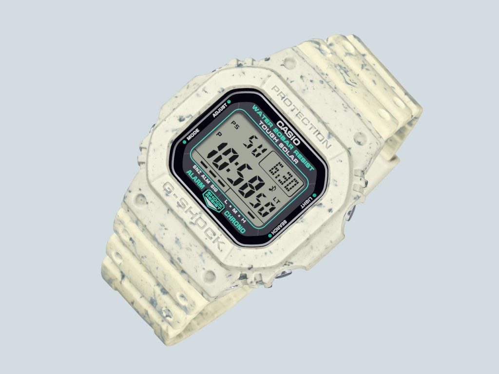 Le G5600BG-5 utilise des résines de déchets d’usine pour sa fabrication, ce qui en fait une montre durable et unique. Chaque montre possède son propre motif et ses propres nuances grâce à ces résidus recyclés.