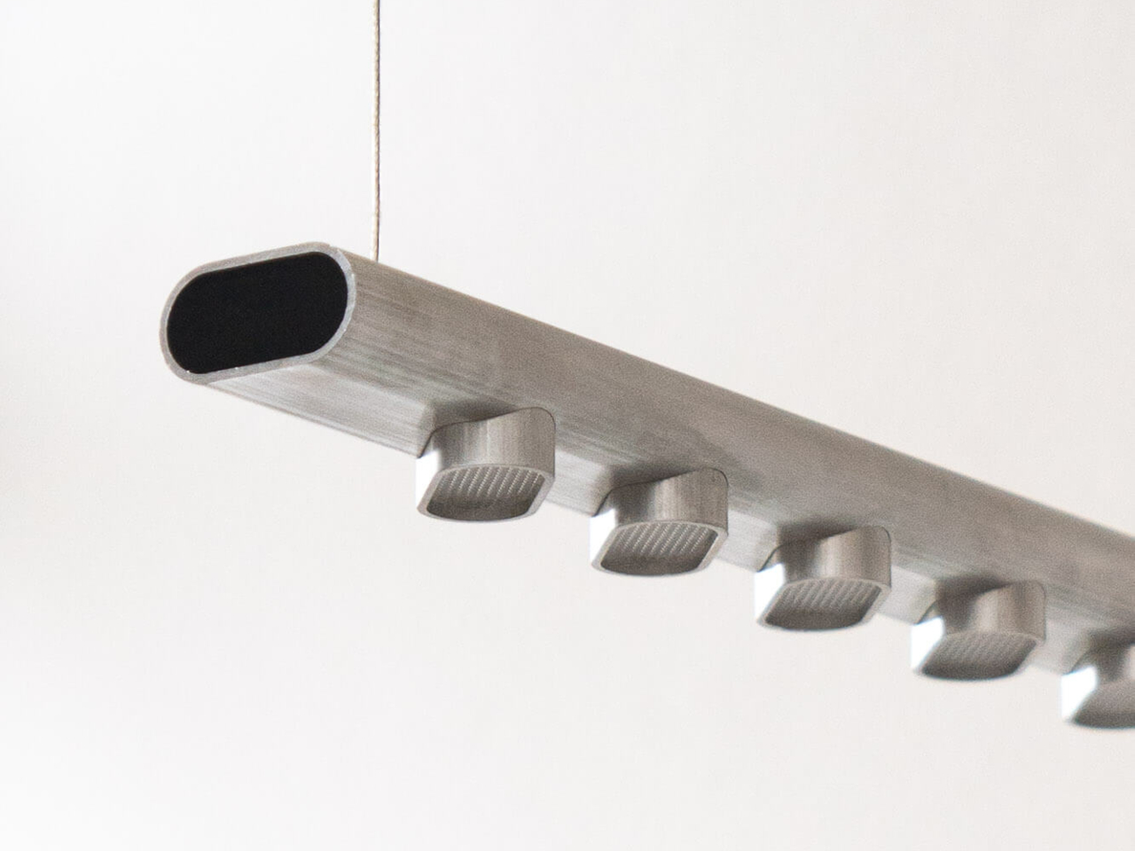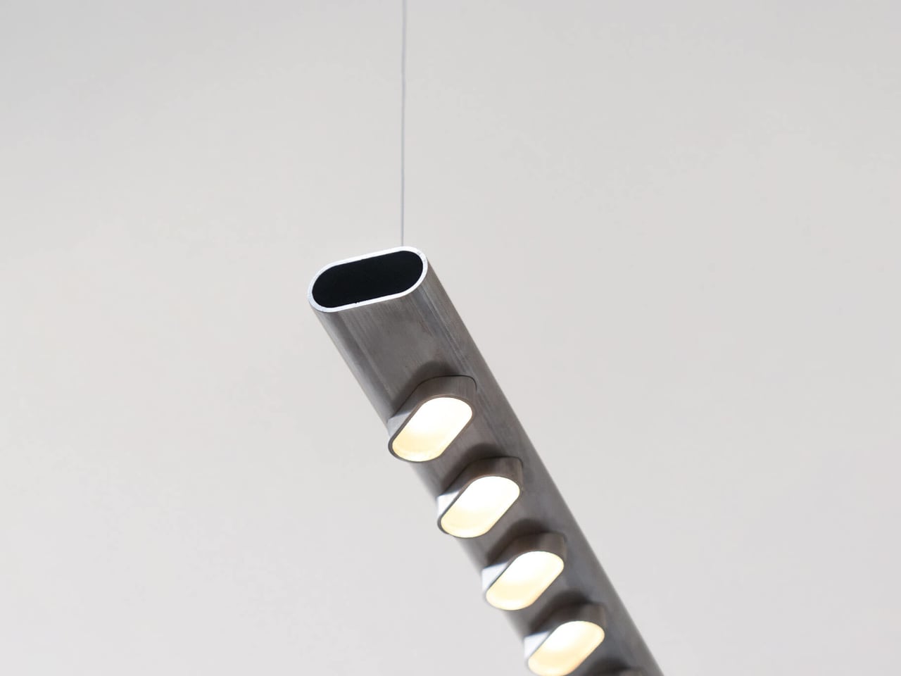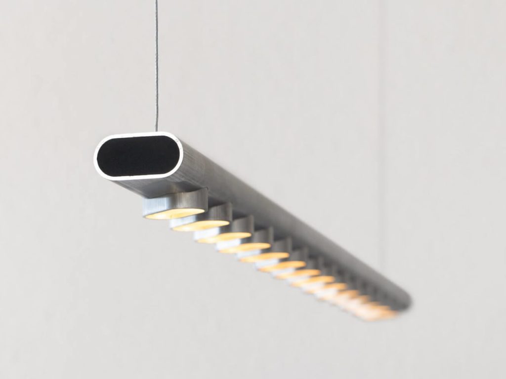 Une longueur droite du tube ovale constitue le corps de la lampe, tandis que des sections plus courtes sont découpées et réassemblées en petits pods le long de sa partie inférieure. Ces pods encadrent les plaques LED et agissent comme de mini-réflecteurs, dirigeant la lumière vers le bas tout en protégeant les diodes de la vue directe. L’utilisation de pièces identiques crée un rythme apaisant tout en évitant d’introduire de nouvelles géométries ou parties supplémentaires.