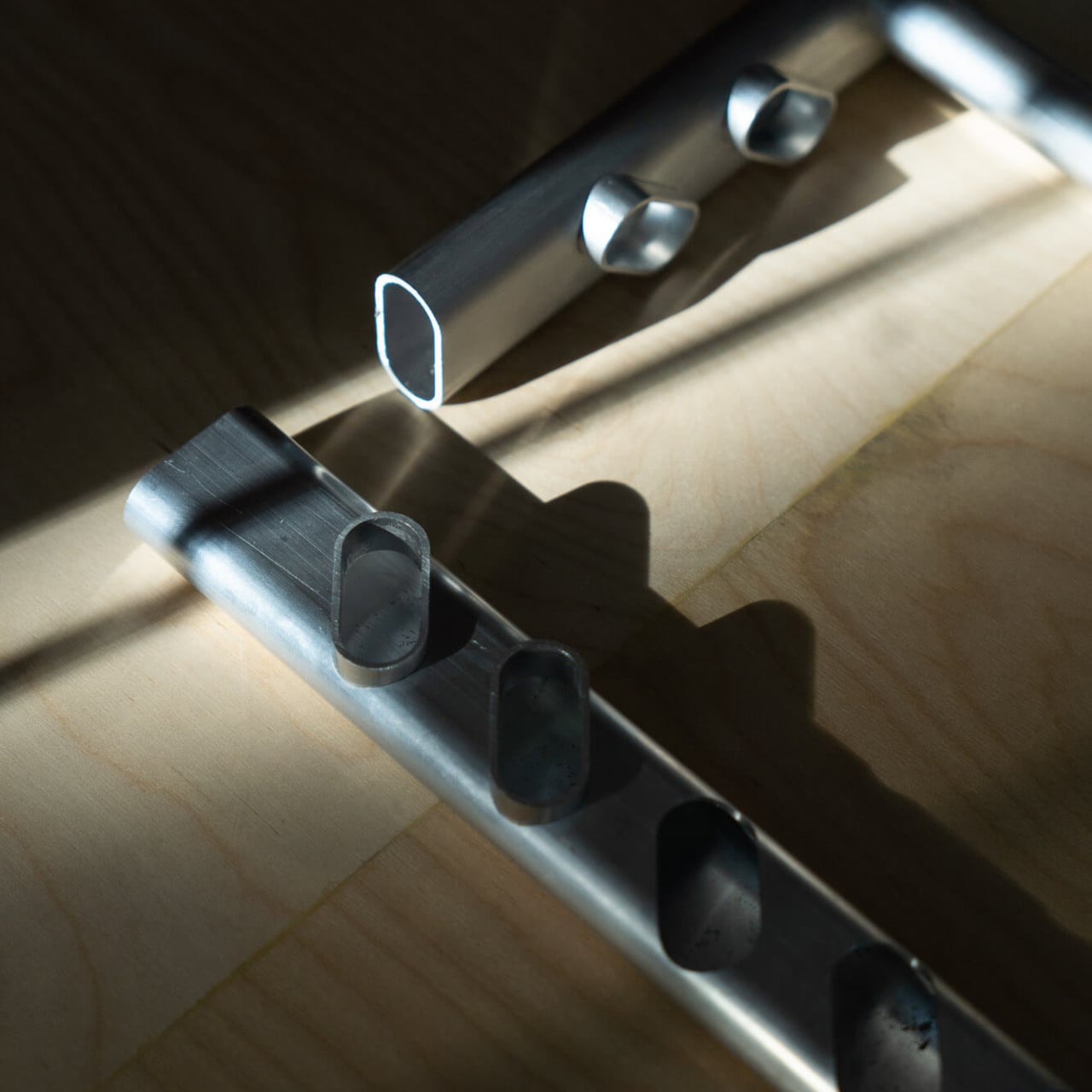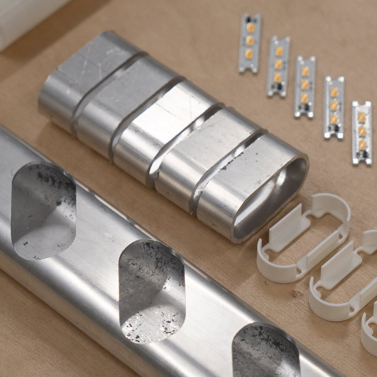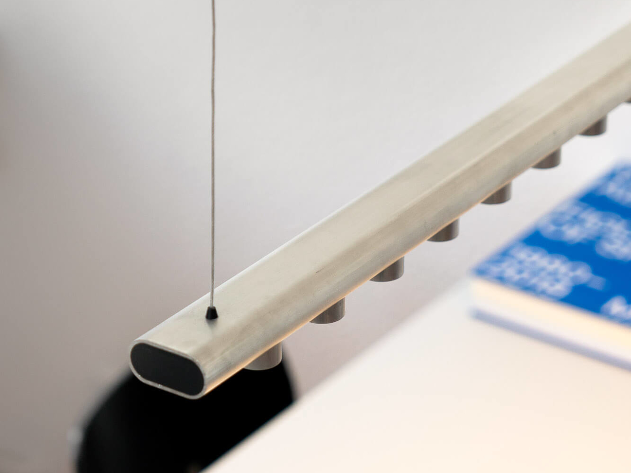 Une longueur droite du tube ovale constitue le corps de la lampe, tandis que des sections plus courtes sont découpées et réassemblées en petits pods le long de sa partie inférieure. Ces pods encadrent les plaques LED et agissent comme de mini-réflecteurs, dirigeant la lumière vers le bas tout en protégeant les diodes de la vue directe. L’utilisation de pièces identiques crée un rythme apaisant tout en évitant d’introduire de nouvelles géométries ou parties supplémentaires.