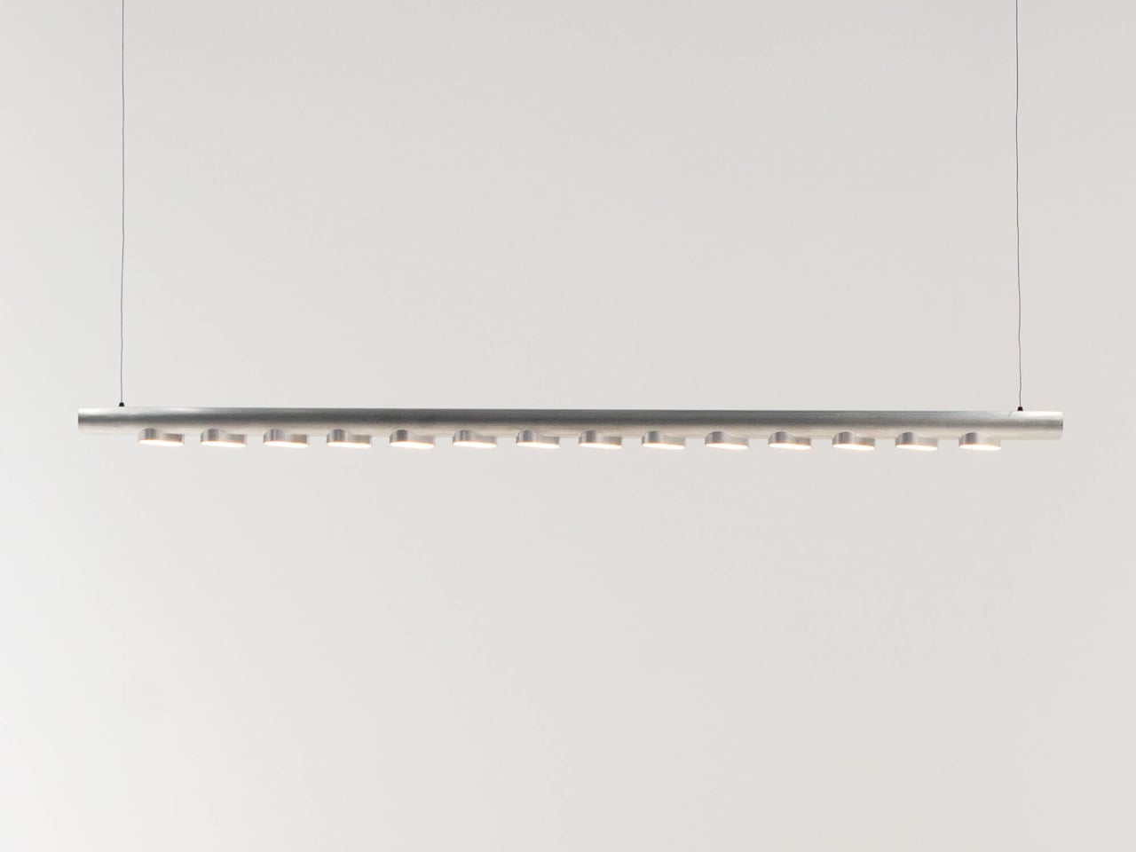 Norm utilise une série de petites plaques LED espacées le long de la poutre, répartissant la lumière de manière uniforme. Les pods directionnels minimisent l’éblouissement, rendant la lampe agréable à utiliser dans divers environnements.