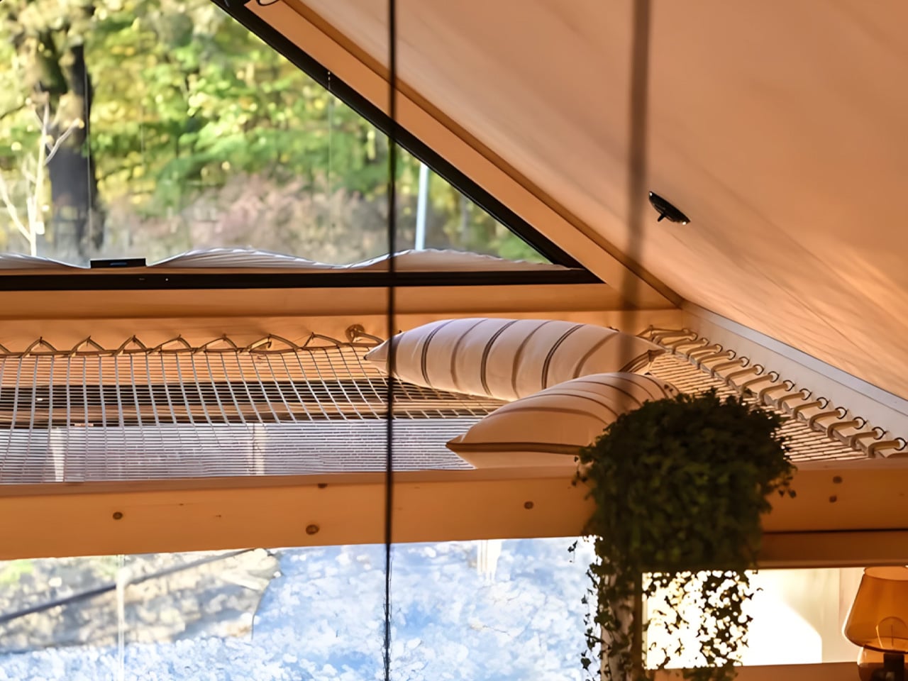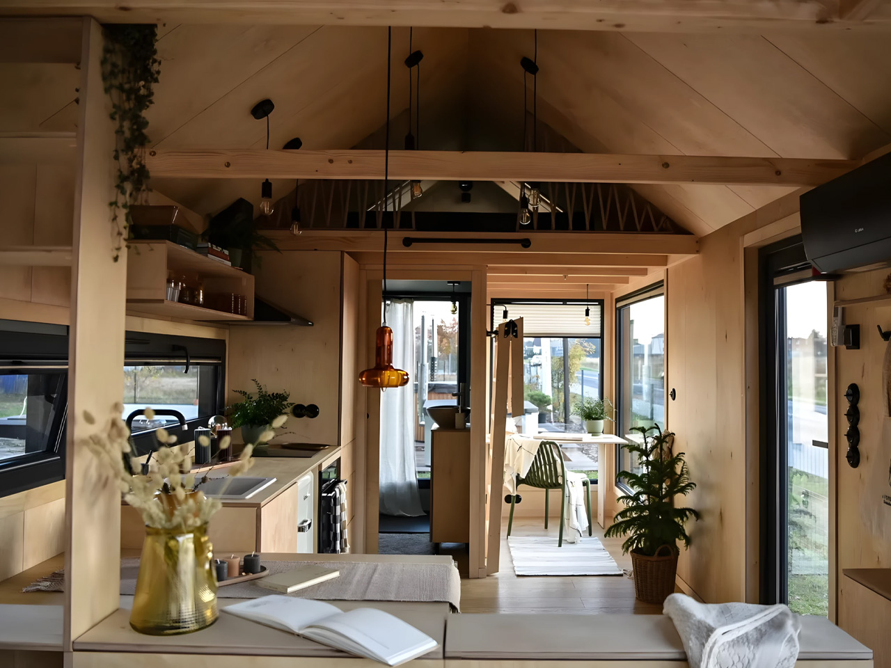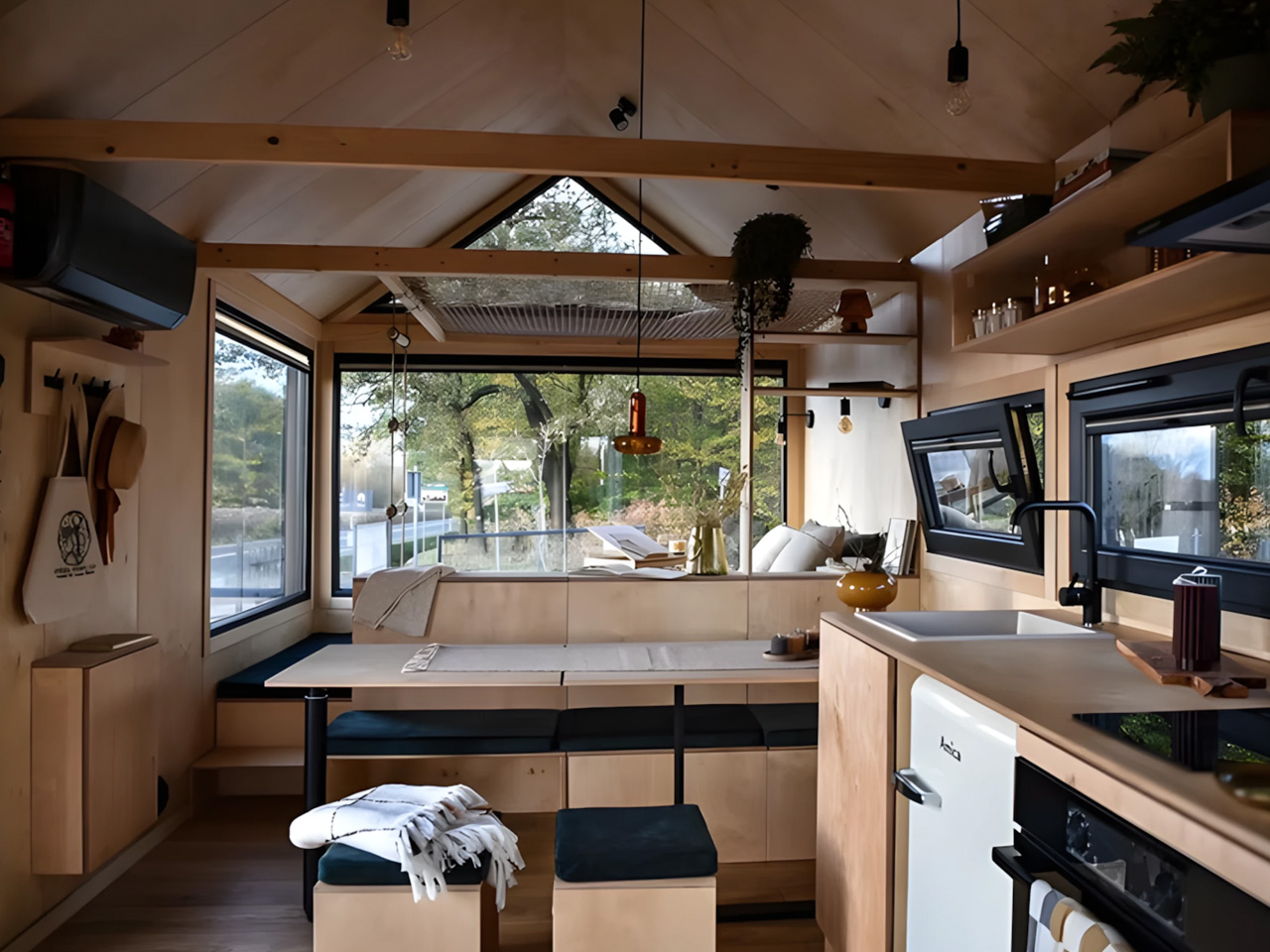 Le point le plus unique de Julia est son mezzanine en filet, un élément de design innovant qui ajoute une dimension ludique à l’espace. L’intérieur exhibe de élégantes parois en contreplaqué, alliant charme rustique et style contemporain, créant une ambiance chaleureuse dans chaque recoin. Ce choix de finition est devenu si populaire qu’il est désormais proposé dans tous les modèles de Vagabond Haven. Les acheteurs ont également l’option de choisir du sapin pour les murs, jumelé à un revêtement de sol stratifié, complétant ainsi l’esthétique scandinave qui donne à la maison son caractère distinct.