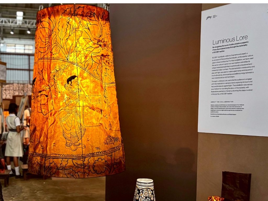 L’installation intitulée Luminous Lore ne se contente pas de montrer une simple exposition de marionnettes. Elle met en lumière l’univers du Tholu Bommalata à travers une lampe inspirée de cette tradition. Le cuir de Kombucha y joue un rôle central en diffusant la lumière, ce qui crée une expérience immersive pour le public. Les jeux de lumière jouent avec les illustrations peintes à la main sur la surface, racontant ainsi l’histoire de la transformation du SCOBY en cuir.