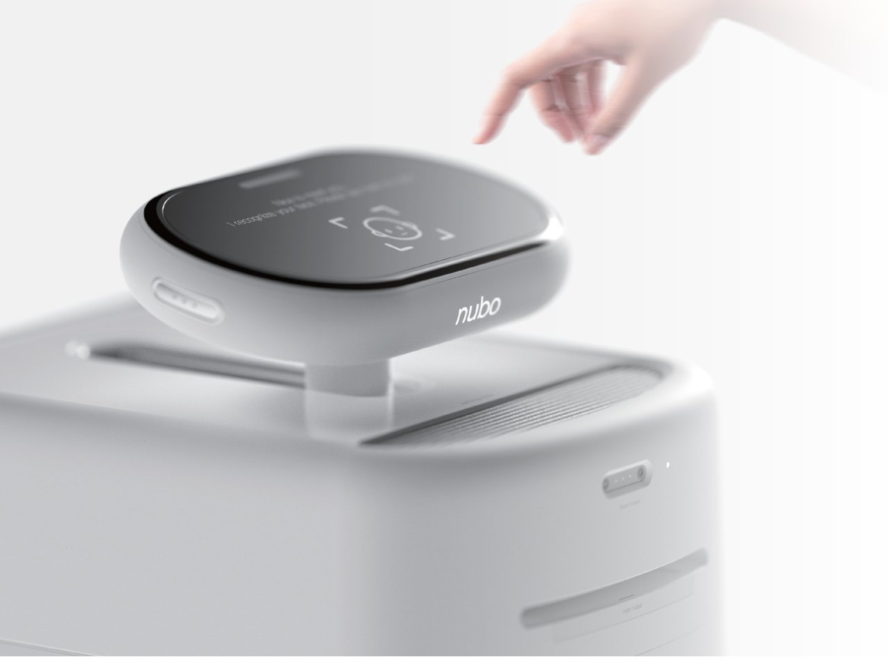 Le design compact et arrondi de nubo est conçu pour s’intégrer subtilement dans les environnements de bureau modernes, sans paraître froid ou intimidant. Sa structure en blanc et gris avec des coins arrondis et un branding discret le rend plus semblable à un collègue prêt à aider qu’à une machine envahissante qui perturbe l’harmonie visuelle de l’espace de travail.