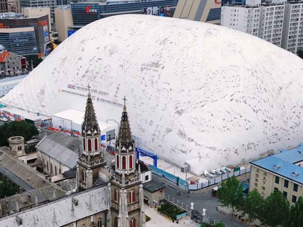 Le dôme de Jinan est une structure inflatable qui recouvre le projet Honglou 1905, mesurant 20 000 mètres carrés et s’élevant à 50 mètres dans le ciel. Cela crée la plus grande enceinte de construction au monde, transformant le site de construction en une opération presque invisible.
