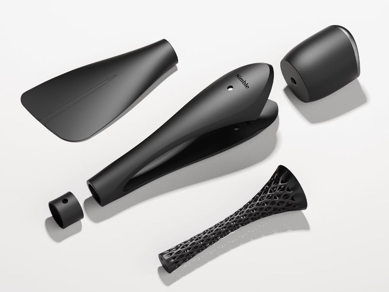 Essesi Design Studio a développé Nimble, un concept de nageoire prosthétique modulaire imprimée en 3D, destiné à offrir aux amputés sous le genou une expérience de nage plus libre, confortable et technologiquement avancée. La prothèse remplace le pied et la jambe inférieure par un cadre en fibre de carbone et une structure en treillis flexible en caoutchouc pour sa souplesse.
