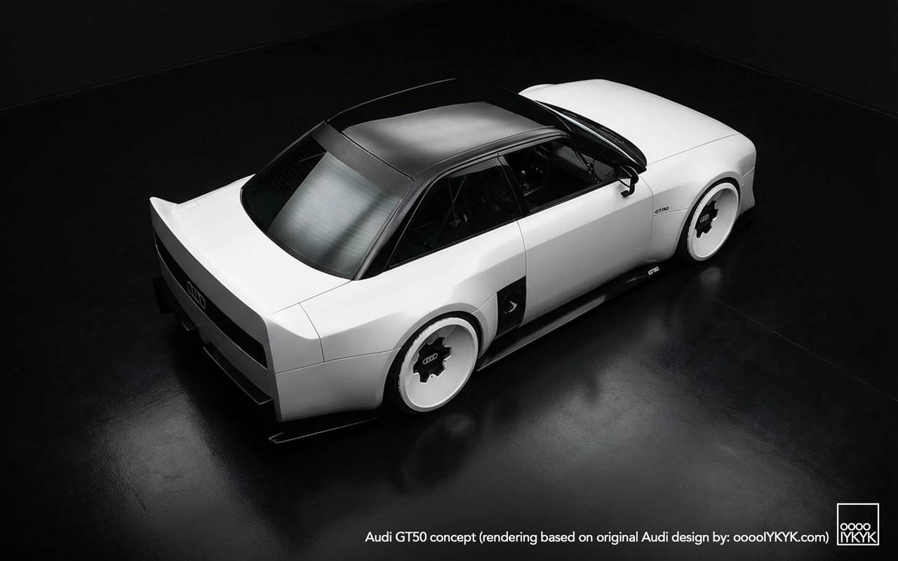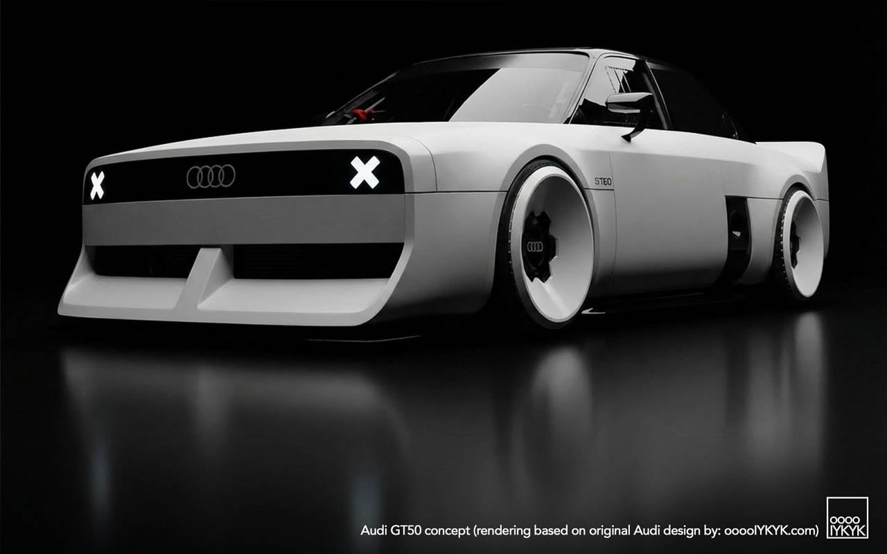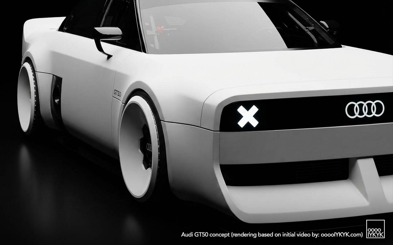 Le GT50 s’inspire principalement de la seconde lignée. Ses proportions empruntent directement aux voitures IMSA : la manière dont les ailes s’élargissent plutôt que de curver, la posture créée par les roues poussées aux coins de la carrosserie et l’aileron s’étendant sur toute la largeur du hayon. Les Quattro de rallye avaient un aspect différent. Le concept reconnaît cette distinction à travers des choix formels spécifiques plutôt que par un style « héritage » générique.